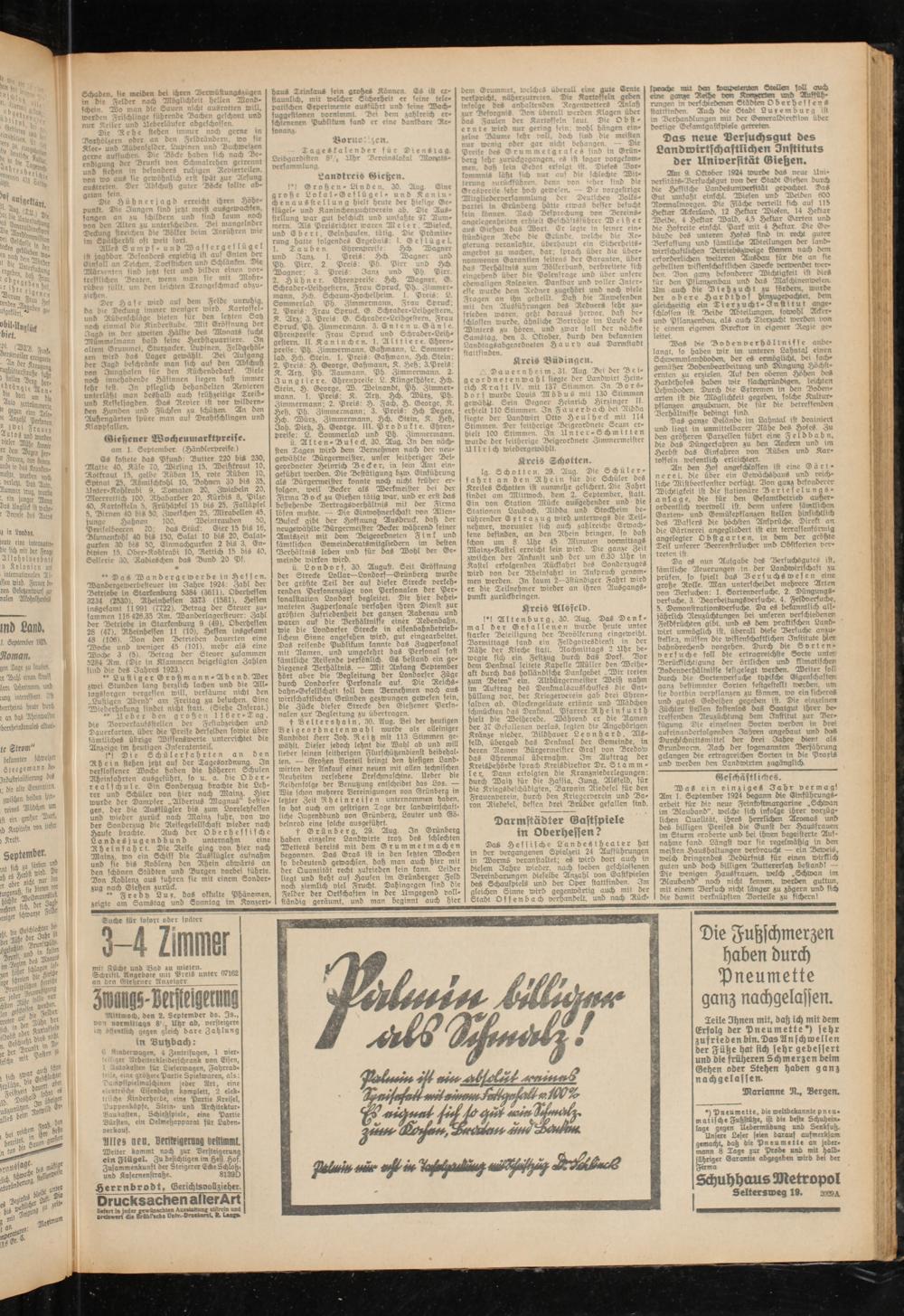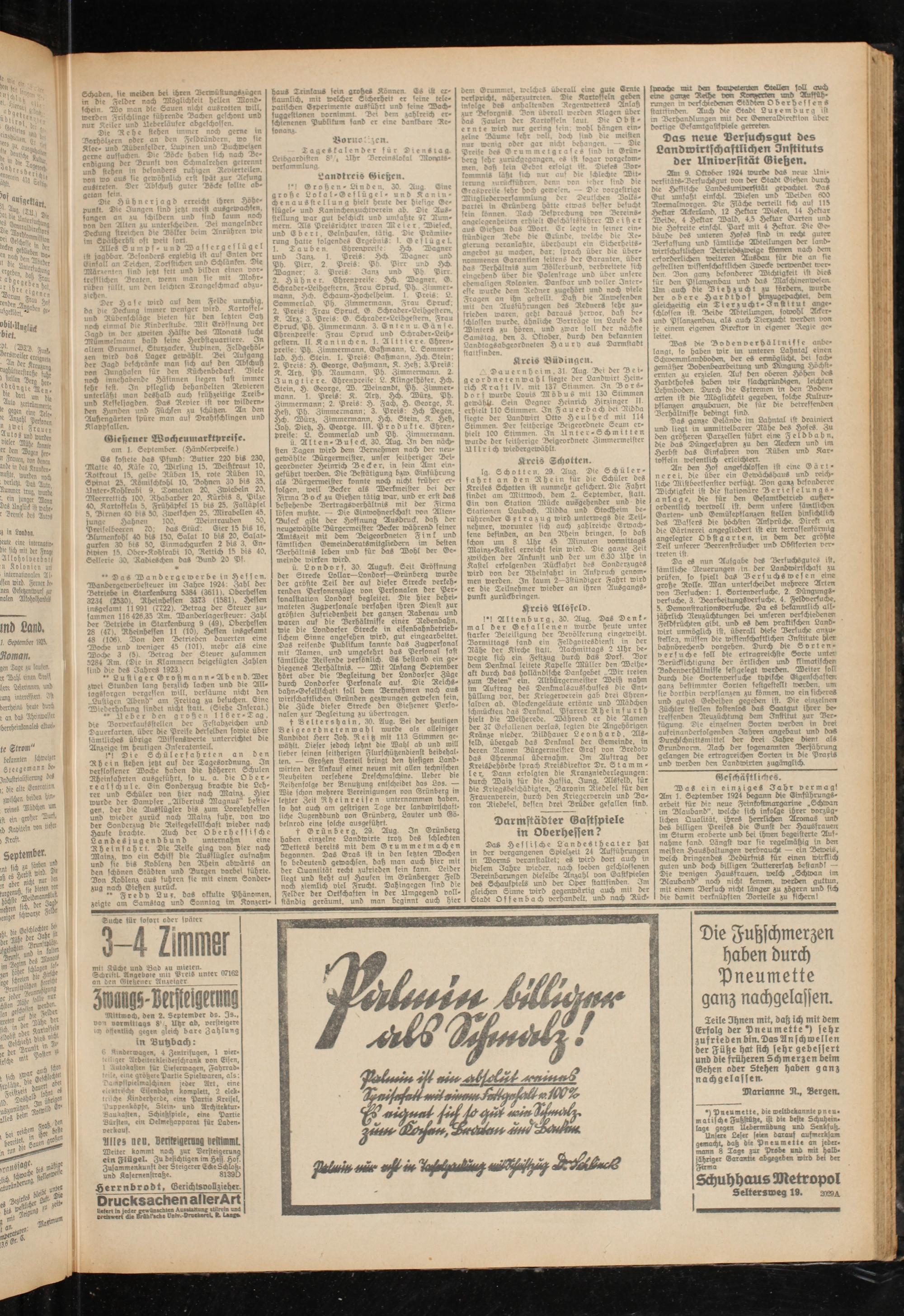 dem Grummet, welches überall eine gute Ernte verspricht, näherzutreten. Die Kartoffeln geben infolge des anhaltenden Regenwetter« Anlaß zur Besorgnis Von überall werden Klagen über das Faulen der Kartoffeln laut. Die Obsternte wird nur gering fein: wohl hängen einzelne Bäume sehr voll, doch find die meisten nur wenig oder gar nicht behangen — Die Preise des Drummetgrafes sind in Grünberg sehr zurückgegangen, es ist sogar vorgekommen. daß kein Gebot erfolgt ist. Diefe« Vorkommnis läßt fich nut auf die schlechte Witterung uirürffübrer. denn von '.her find die Grasvrcife febr hoch gewesen. — D e vorgestrige Mitgliederversammlung der Deutschen Dolks- Dartci in örünberg hätte etwas besser besucht fein können Vach Besprechung von Dereins- angelegenhetten erhielt Gefchäftssührer Weißer aus Gtehen das Wort. Er legte in seiner ein- stündigen Rede die Gründe. tvelche die Regierung veranlaßte, überhaupt ein Sicherheitsangebot zu machen, dar: sprach über die übernommenen Garantien seitens der Garanten, über das Verhältnis zum Völkerbund, verbreitete sich eingehend über die Polensrage und über unsere ehemaligen Kolonien Dankbar und voller Interesse wurde dem Redner zugehört und noch viele Fragen an ihn gestellt. Daß die Anwesenden mit den Ausführungen des Redners sehr zufrieden waren, geht daraus hervor, daß beschlossen wurde, ähnliche Vorträge im Laufe des Winter« zu hören, und zwar soll der nächste Samstag, den 3. Oktober, durch den bekannten Landtagsabgeordneten Haury au« Darmstadt stattfinden.
