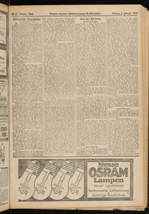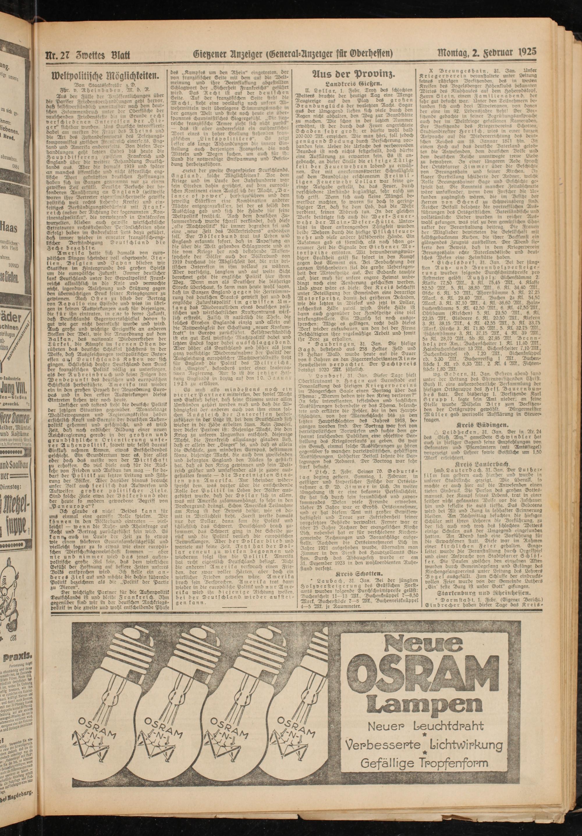 Nr. 27 Zwette5 Bl^Gieyener Anzeiger (General-Anzeiger für Oberhessen)Montag, 2. Februar 1925