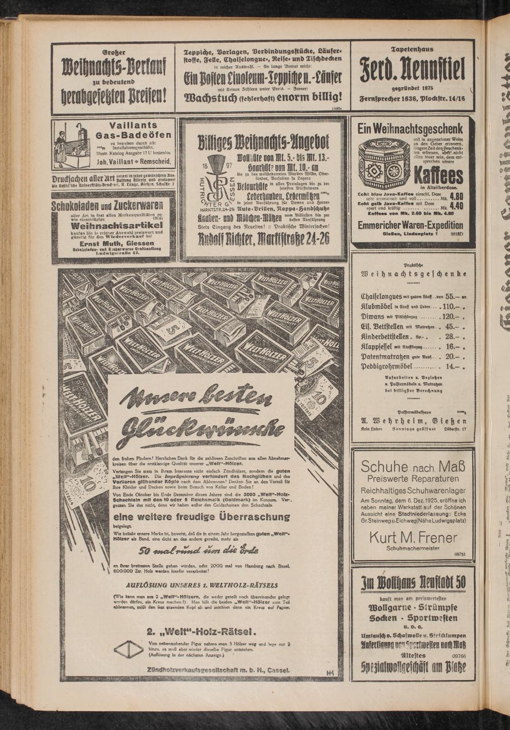 Preiswerte Reparaturen Reichhaltiges Schuhwarenlager Am Sonntag, dem 6. Dez. 1925, eröffne ich neben meiner Werkstatt auf der Schönen Aussicht eine Stadtniederlassung: Ecke Gr.Steinweg u.Eichweg(Nähe Ludwigsplatz)