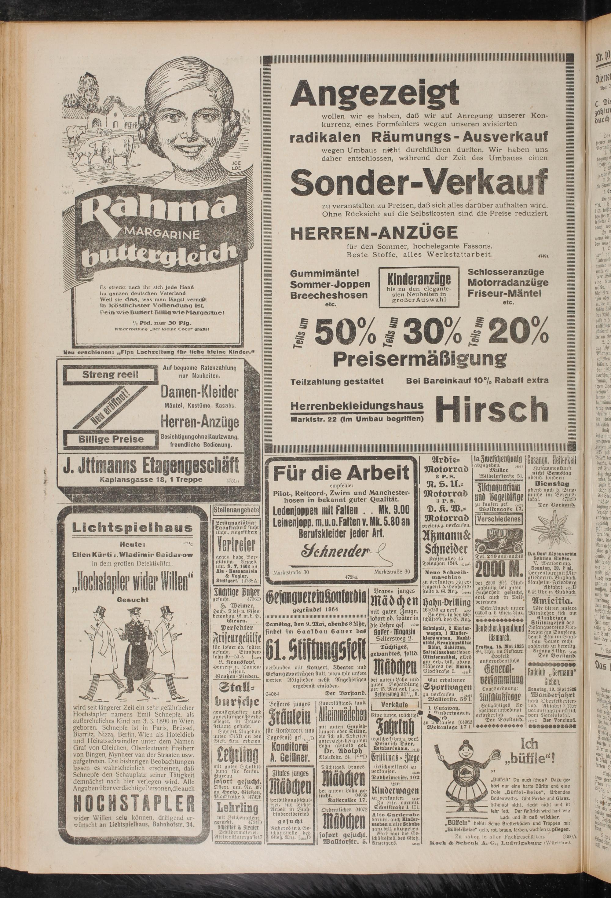 wird seit längerer Zeit ein sehr gefährlicher Hochstapler namens Emil Schnepfe, als außereheliches Kind am 3. 3.1890 in Wien geboren. Schnepfe ist in Paris, Brüssel, Biarritz, Nizza, Berlin, Wien als Hoteldieb und Heiratsschwindler unter dem Namen Graf von Gleichen, Oberleutnant Freiherr von Bingen, Mynheer van der Straaten usw. aufgetreten. Die bisherigen Beobachtungen lassen es wahrscheinlich erscheinen, daß Schnepfe den Schauplatz seiner Tätigkeit demnächst nach hier verlegen wird. Alle Angaben über verdächtigePersonen,dieauch HOCHSTAPLER wider Willen sei» können, dringend erwünscht an Lichtspielhaus, Bahnhofstr. 34.