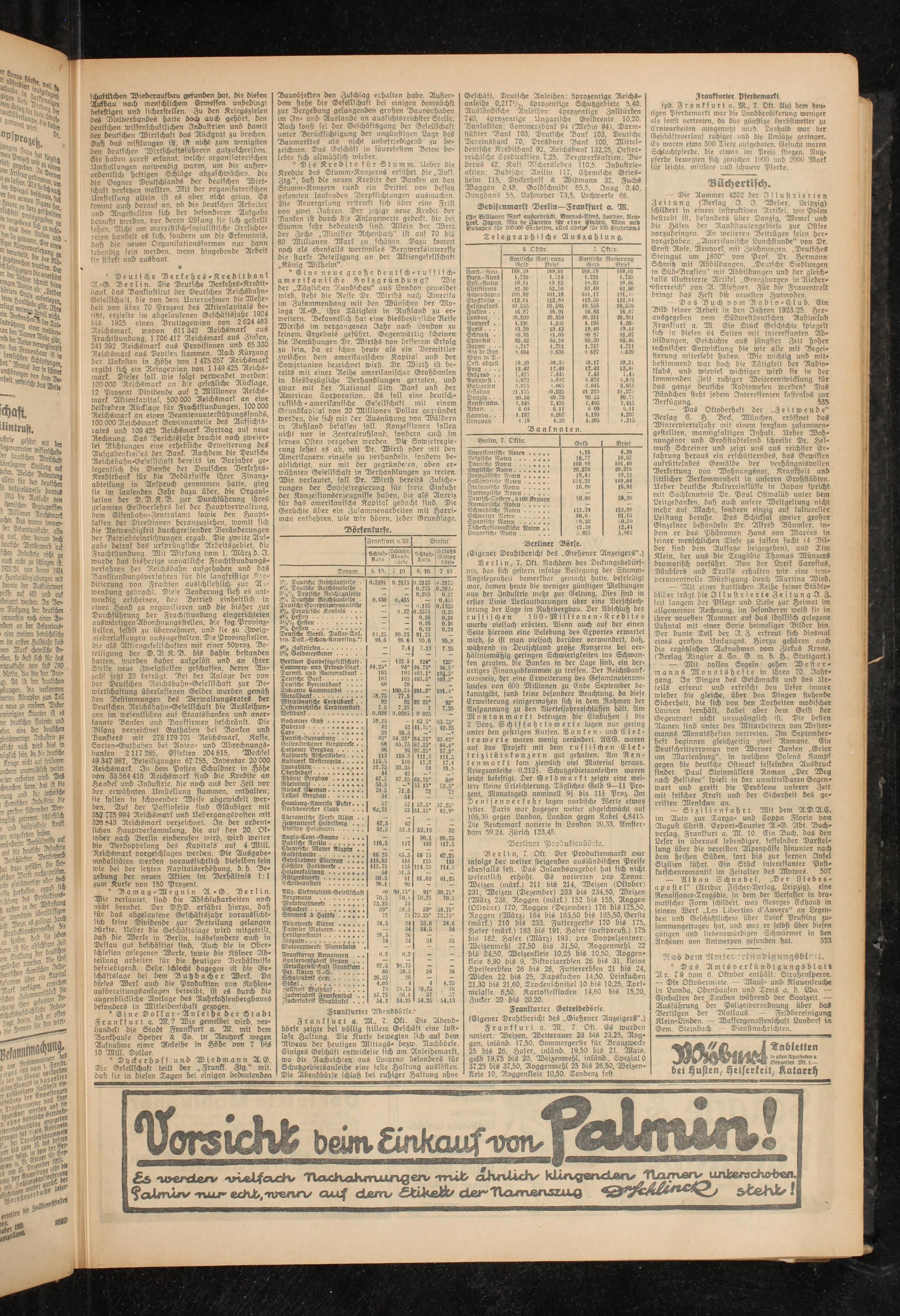 Berlin, 7. Oft. Der Produltenmarkt axir infolge der weiter steigenden ausländischen Preise ebenfalls fest. Das Inlandsangebot hat sich nicht wesentlich erhöht. Es notierten pro Tonne: Weizen (märf.) 211 bis 214, Weizen (Oktober) 231, Weizen (Dezember) 233 bis 234,50, Weizen (März 238, Roggen (märf.) 152 bis 155, Roggen (Oktober) 170, Roggen (Dezember) 176 bis 175.50, Roggen (März) 184 bis 183,50 bis 185,50, Gerste (märf.) 210 bis 233, Futtergerste 170 bis 175, Hafer (märf.) 183 bis 191, Hafer (westpreuh.) 175 bis 182, Hafer (März) 193; pro Doppelzentner: Weizenmehl 27,50 bis 31,50, Roggenmehl 22 bis 24,50, Weizenfleie 10,25 bis 10,50, Roggen- fleie 8,90 bis 9, Viftoriaerbsen 26 bis 31, kleine Speiseerösen 26 bis 28, Futtererbsen 21 bis 24, Wicken 22 bis 25, Rapskuchen 14,50, Leinfuchen 21,30 bis 21,60, Trockenschnihel 10 bis 10,25, Torfmelasse 8,50, Kartoffelflocken 14,80 bis 15,20, Zucker 20 bis 20,20.