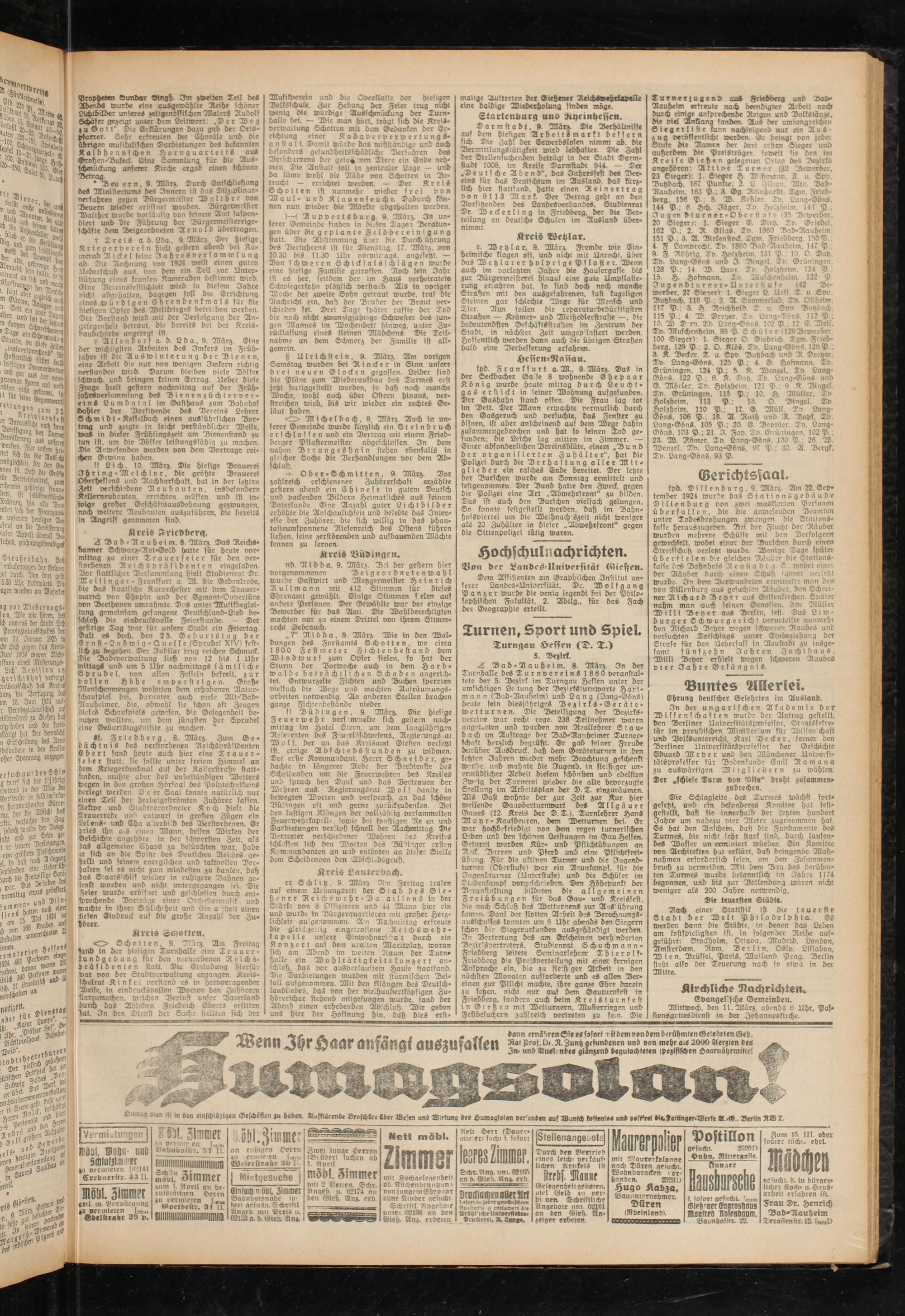 Darmstadt, 9. Mär». Die Derhällnisfe auf dem hiesigen Arbeilftmarkt bessern sich. Die Zahl der Erwerbslosen nimmt ab. die Detmitrlunastätigtest wird lebhafter. Die Zahl der Stcllensuchenben betragt in der Stadt Darmstadt 1008. im Kreise Darmstadt 944. — Der .Deutsche Abend", das Iahresfest des Der- eins für das Deutschtum im Ausland. daS kürzlich hier ftattfanb, hatte einen Reinertrag von 9113 Mark. Der Betrag geht an den Vorsitzenden des Landesverbandes, ©tubienrat Dr. Weckerling in Friedberg, der die Der- teilung an deutsche Schulen im Ausland übernimmt.