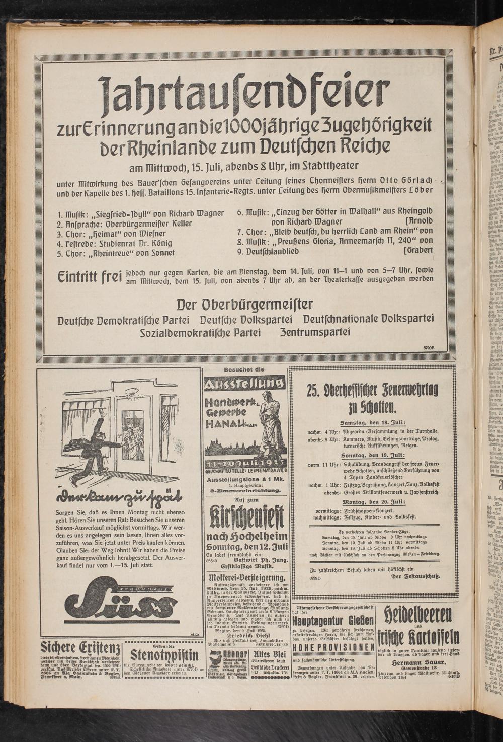 Er verkehren folgende Sonder-Züge: Samstag, den 18. Juli ab Nidda 3 Uhr nachmittags Sonntag, den 19. Juli ab Nidda 11 Uhr vormittags Sonntag, den 19. Juli ab Schotten 8 Uhr abends nach Gießen mit Anschluß an den Personenzug Gießen - Friedberg.