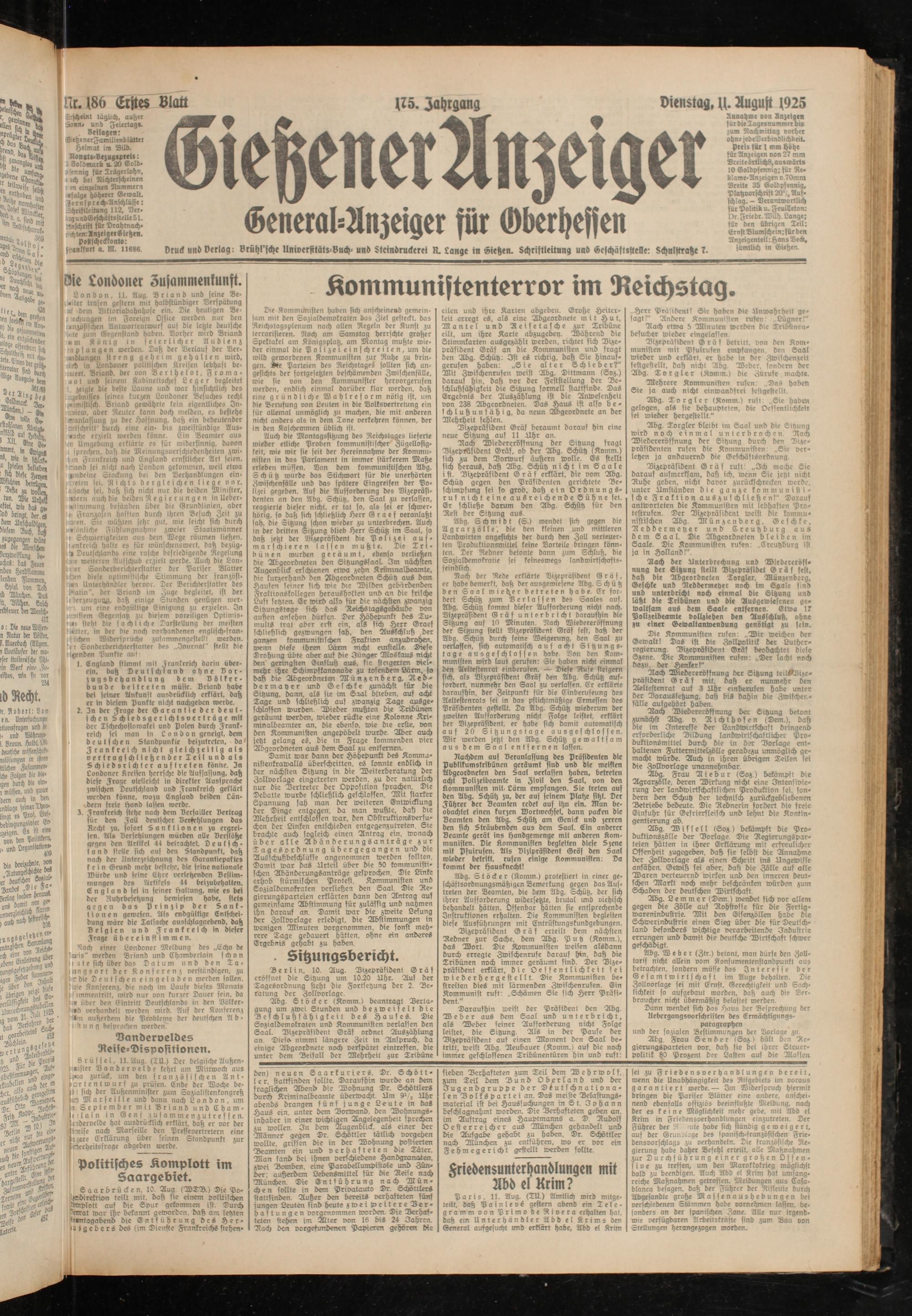 Annahme von Anzeigen für die lagesnummctois zum Nachmittag vorher ohne jeüeVerbindlichNeit. preis für l mm höhe für Anzeigen von 27 mm Breite örtlichS, auswärts 10 Goldpfennig; für Reklame-Anzeigen ü.70mm Brette 35 (Bolbpfennig, Platzvorschrist 20e/e Aufschlag. - Verantwortlich für Politik u. Feuilleton: 1 )r. Friedr. Wilh. Lange; für den übrigen Teil: Ernst Dlumschein, für den An zeigenteil: Hans Beck, sämtlich in Gießen