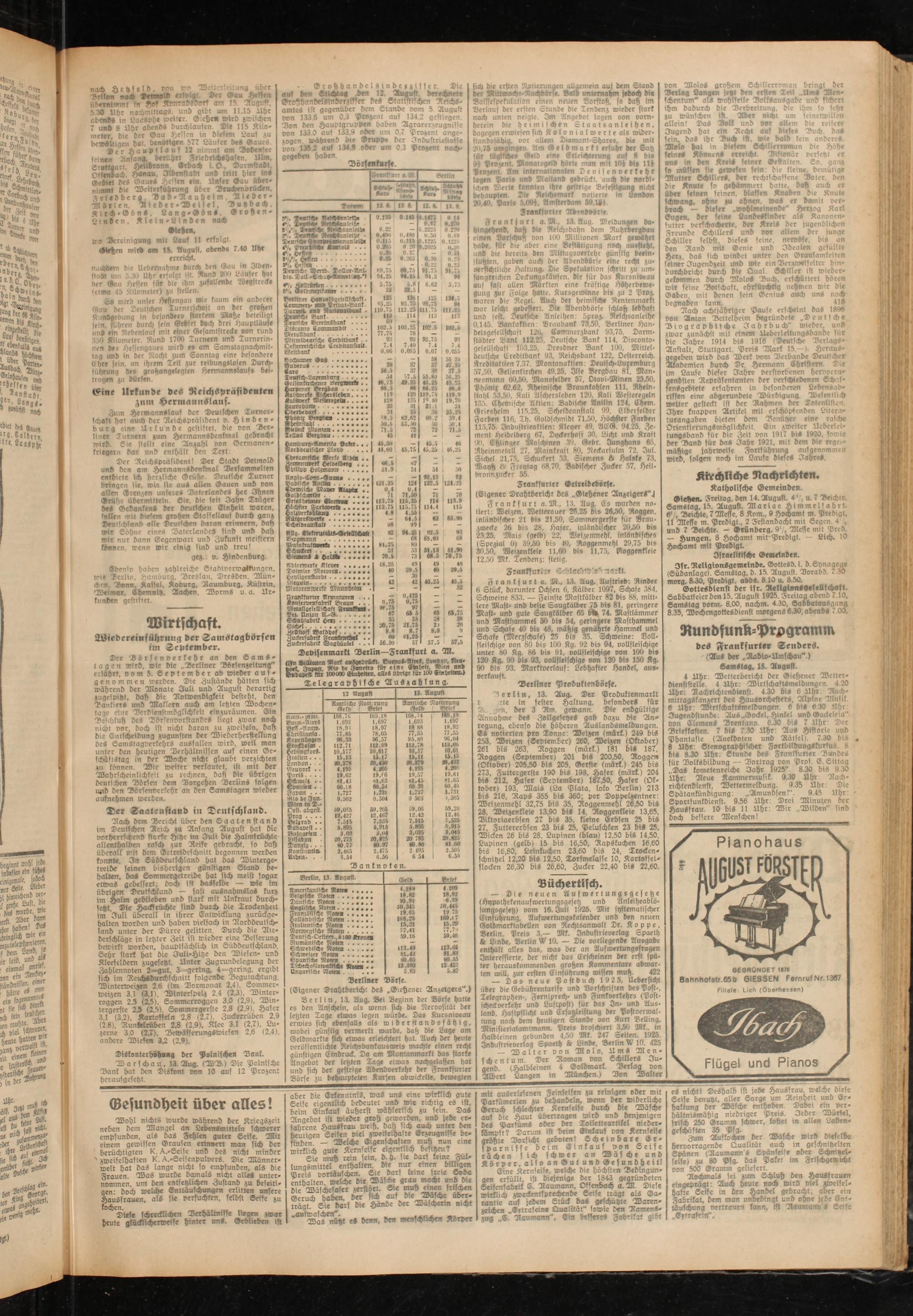 Siesten. Freitag, den 14. August. 4' u. 7 Beichte. Samstag. 15. August. Mariae Himmelfahrt. 6’/, Deichte. 7Messe, g Kom., S Hochamt m. Predigt, 11 Messe m. Predigt., 2 Festandacht mit Segen. 4 , und 7 Deichte. - Srünberg. 91/, Messe mit Pred. — Hungen. 8 Hochamt mit Predigt. Lich. 10 Hochamt mit Predigt.