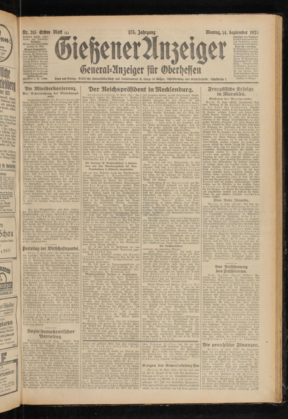 Preis für 1 mm höhe für Anzeigen von 27 mm Breite ortlichS, auswärts 10 Goldpsenrng; für Re- Klame-Anzeigen v 70mm Breite 35 Goldpfennig, Plahvorschrist20 .Ausschlag. - Verantwortlich für Politik u. Feuilleton: l)r Friedr Witt) Langes für den übrigen Teil: Ernst Blumschein Würden ?lnzeigenteil:.^ansBech, sämtlich in Gießen