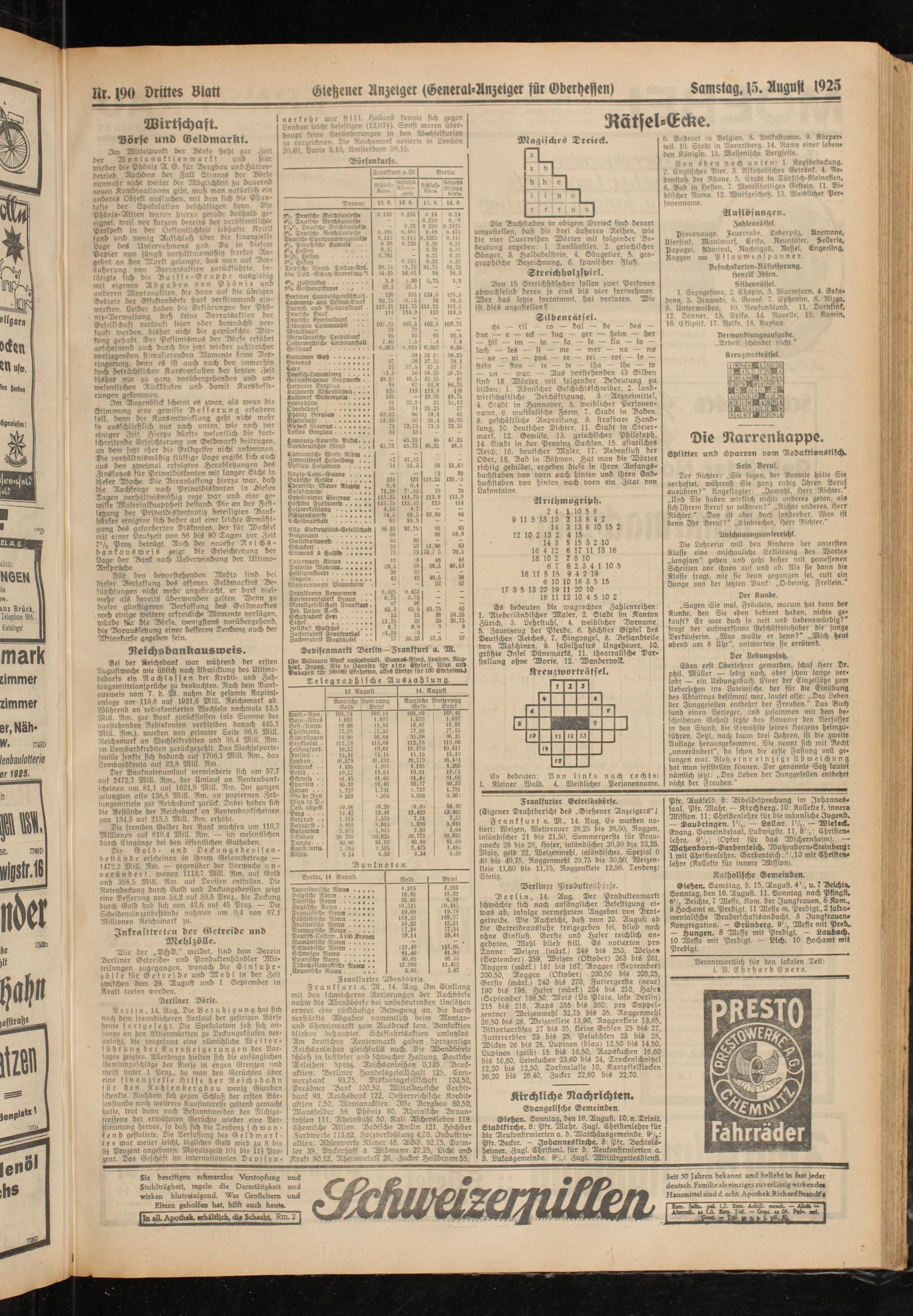 Gießen. Sonntag, den 16. August. 10. n. Trinit. Etadtkirche. 8: Pft. Mahr. Zugl. Christenlehre für die Reukonfirmierten a. d. Matthäusgemeinde. 9*/,; Pft. Becker. - JohanneSttrche. 8: Pft. BechtolS- heimer. Zugl. Christenl. für d. Reukonfirmierten a. d. Lukasgemeinde. 91/,: Zugl. WiiitärgotteSdienst.