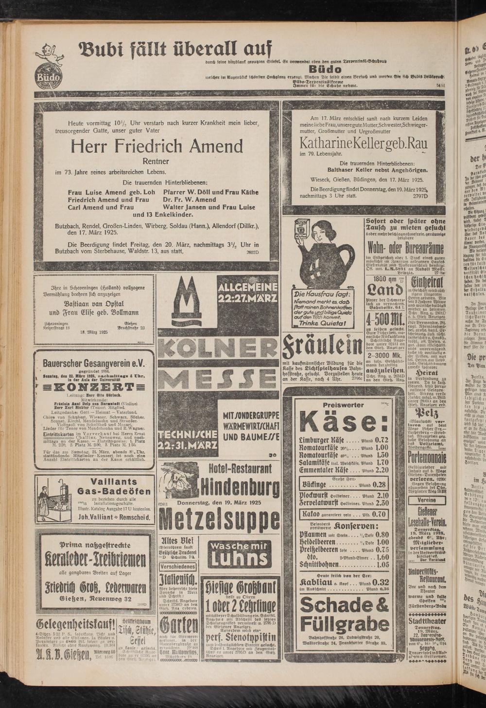Balthaser Keller nebst Angehörigen, Wieseck, Gießen, Büdingen, den 17. März 1925.