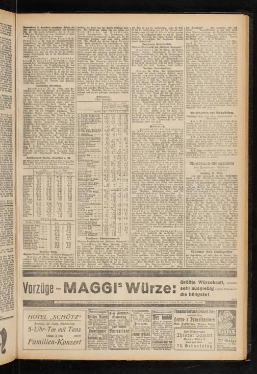 11.55 Llhr. Zeitangabe. 12 Uhr Rachrichtendien st. 4 Llhr: Wirtschaft-Meldungen. 4.20 Llhr: Rachrichtendienst 4.30 bis 6 Llhc: RachmittagS- Konzert des Hausorchesters: Aus zeitgenössischen Opern. 1. Phant aus „Das Mädchen aus dem goldenen Westen" von Puccun. 2 Phant. aus .Elektra" von R Strauß. 3. Pham! a. d. .Toten Stadt" von Koimgold 4. Phant auS .Pellsas und Melisande" von Debussy. 5. Phant aus .Ariadne auf Raxos" von R. Strauß. 6.- Phant. au8 .Die spanische Stunde" von Ravel. 6 Llhr Wirt- schaslsmeldungen. 6 bis 6.30 Ahr: Die Lese- stunde (An die Jugend) Aus dem Roman „Peter Sunpel" von Cavit -in Marryat. 6.30 bus 7 Ahr: Der Briefkasten 7 bis 7.30 Ahr Funlhochschnle, Prof. Künzel: „Aus der ®e- schichte d?s deutschen Ülntimef)tncrtunt8“, 6. Dor-- trag. 7.30 bis 8 Ahr. Funkhochschule. Dortrag von Prof. Dr. Schultz: „Rainer Maria Rilkes Art und Kunst". 8 bis 8.33 Ahr: Stunde des Frankfurter Bundes für Dollsbilduntz. Dortrag zum Frühlingsanfang von Professor Sittig: „Der Frühling". 8.30 bis 9.30 Ahr: Das We hnachtS- oratorium von Joh. Seb. Bach (Dortvng und praktische Darstellung des Werkes). Ausführende Kapellmeister Hermann Sch?rchen (Dortrag uni musikalische Leitung) Solisten: Frl. Kleinschmidt. Frl Levi, Herr Bohndorfs. Herr Holl — Mitglieder des Rühl'schen Gesangvereins Cembalo: Herr Dr Ehrerrreich — Harmonium Herr Dr eiben st ein. 9.30 Ahr: Rachrichten, Wel termeldung. Sportbericht. 10 bis 11 Uhr. Kon zert des Mandolinen «Orchesters „Estudiant ma".