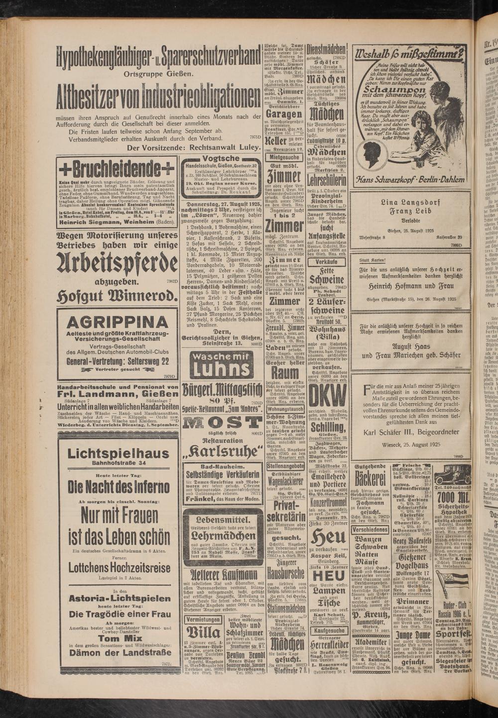 Donnerstag, 27. August 1925, nachmittags 2 Uhr, versteigere ich im ,,Löwen", Neuenweg dahier zwangsweise gegen Barzahlung: