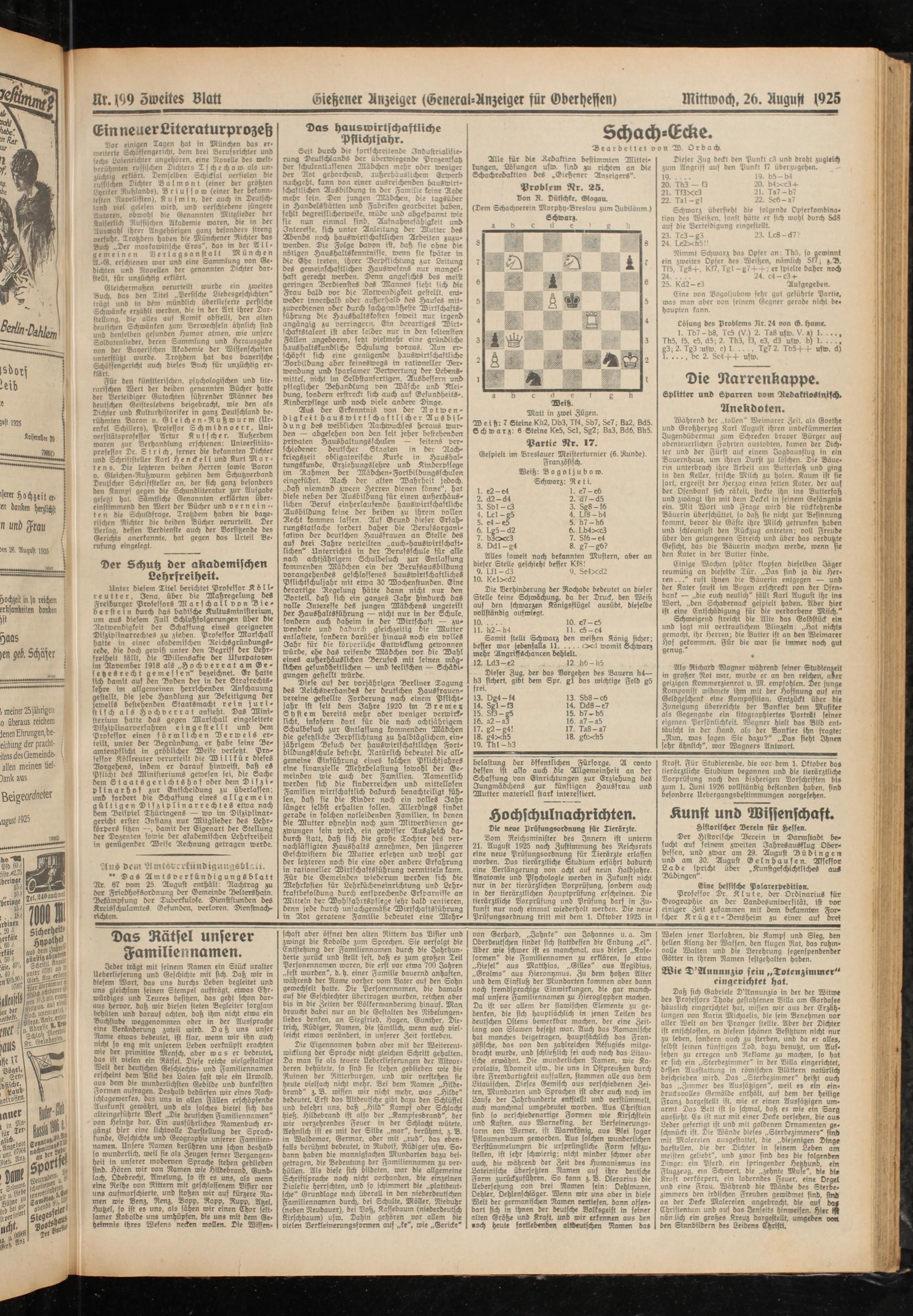 Alle für die Redaktion bestimmten Mitteilungen, Lösungen usw. sind zu richten an die Schachredaktion des .Gießener Anzeigers".