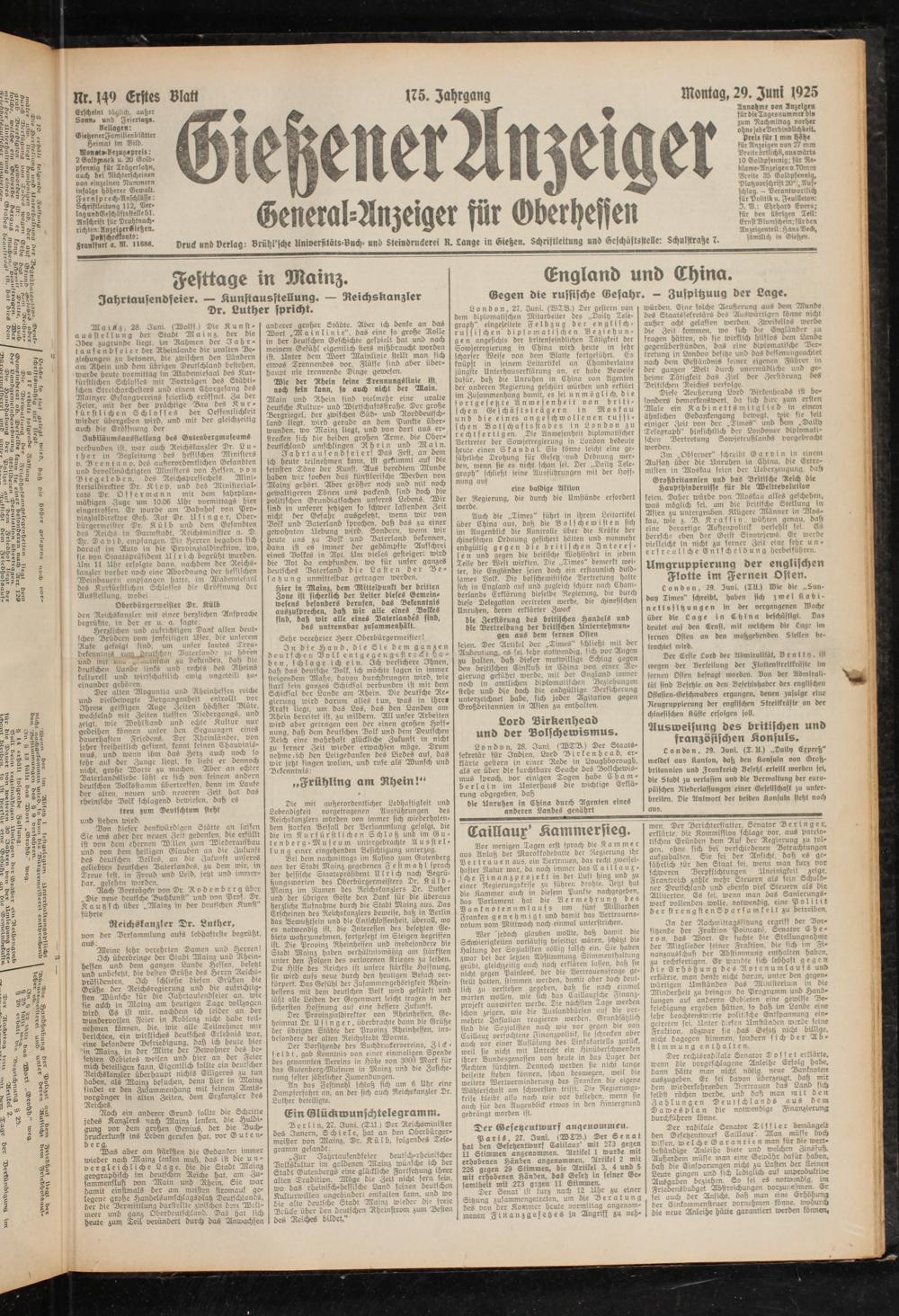 Jubiläumsausstellung des Gutenbergmuseums verbunden ist, war auch Reichskanzler Dr. Luther in Begleitung des hessischen Ministers v. Brentano, des außerordentlichen Gesandten und bevollmächtigten Ministers von Hessen, vo n Viegeleben, des Reichspressechefs Ministerialdirektor Dr. Kiep, und des Ministerialrats Dr. Off ermann mit dem fahrplanmäßigen Sugc um 10.06 Hhr vormittags hier eingetroffen. Er wurde am Bahnhof von Provinzialdirektor Geh. Rat Dr. Hsing er, Oberbürgermeister Dr. Külb und dem Gesandten des Reichs in Darmstadt, Reichsminister a. D. D,r. David, empfangen. Die Herren begaben sich darauf im Auto in die Provinzialdirektion, wo sie von Staatspräsident H l r i ch begrüßt wurden. Hm 11 Hhr erfolgte dann, nachdem der Reichs- lanzler vorher noch eine Abordnung der hessischen Weinbauern enrpfangen hatte, im Amdemiesaal des Kurfürstlichen Schlosses die Eröffnung dec Ausstellung, wobei
