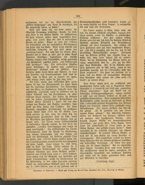 Die Oper wurde vom kaiserlichen Hofe unterhalten, sie war der Sammelpunkt des hohen Adels und der erlesensten Gesellschaften. Die Schaubühne und den Glanz der Ausstattung beschreibt Loän sehr ausführlich, namentlich ward an Costümen und an ächtem Schmuck von den Darstellenden ein übertriebener Luxus entfaltet. Der Kaiser, die Kaiserin und die beiden „Jofephinischen" Prinzessinnen (die Töchter Kaiser Joseph's I., später mit den Kurprinzen von Bapern und Sachsen vermählt), sitzen gleich zur Erde hinter dem Orchester. Die heute allgemein eingeführte Verfinsterung des Zuschauerraums scheint schon 1716 bei der Wiener Oper üblich gewesen zu sein, denn bei jedem Sitz der obengenannten Herrschaften stand ein Licht, damit die Majestäten und Hoheiten lesen konnten, was gesungen wird. Die Opern waren selbstverständlich in italienischer Sprache verfaßt, die dem Texte beigedruckten „teutschen Uebersetzungen aber lauten oft gantz unerträglich." Die Kostspieligkeit des Opern- Unternehmens, sowie die Pracht der Ausstattung, mag daraus hervorgehen, daß eine einzige, zur Feier des Geburtstags der Kaiserin gegebene Oper den Kaiser über 100 000 Thaler gekostet haben soll. Die Opernsängerinnen wurden damals weit glänzender als heute bezahlt. Zwar sangen sie, nach Loän, nicht im Sold und Lohn. Dafür nahmen sie in liebenswürdiger Bescheidenheit mit „einem standsmäßigen Unterhalt und einem Geschenk vorlieb." Letzteres war freilich selten unter 2—3000 Dukaten. Dazu kamen noch die Geschenke von fürstlichen und hohen Privatpersonen, welche die Künstlerinnen für die Mitwirkung in den ersten Concerten erhielten. Selbst ein mittelmäßiger Violinist stand sich damals auf 2—3000 Gulden, war er ein Italiener und in