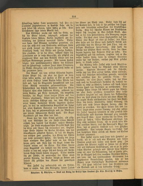 Die Rettung sollte Juffuf nicht durch Menschenhand, sondern durch die Kühnheit eines Thieres werden. Capitain Ronceval und die Scheichs, welche jetzt den Eber zerlegt hatten, eilten nunmehr, durch das Schießen aufmerksam gemacht, vorwärts und erblickten hier die gräßliche Scene. Der Capitain, ein alter Jäger, wußte, daß der Löwe auch noch im Todeskampfe furchtbar ist, deshalb beschloß er, nicht zu schießm, sondern erst durch seinen braven Hund das Raubthier zu verscheuchen. Das muthige Thier stürzte sich bellend gegen den Löwen, der aber stand, gleichsam verwundert über solche Frechheit langsam auf und schaute den Ankömmling starr an, hielt jedoch sein Opfer mit einer Klaue fest. In engem Kreise umschwärmte der Hund das Raubthier, "bis di-sts, überdrüssig solcher Störung, sich ducke und nach seinem Gegner sprang, ohne ihn jedoch zu erreichen. Der Hund lärmte fort und der Löwe wagte einen zweiten Sprung; jetzt aber wälzte sich Juffuf langsam seitwärts in eine ziemlich tiefe Wasserfurche und Capitain Ronceval ging nunmehr zum Angriff über. Zwar wandte sich der Löwe, sein Opfer zu such>n, deffen Blutspuren allerdings den Weg nicht verfehlen ließen, ehe er jedoch feine Ab- sicht erreichen konnte, traf ihn Ronceval's Kugel ins Knie, daß er gräßlich brüllend nach dem Hölzchen zurückhinkte. Von dreizehn Kugeln durchbohrt sank das furchtbare Thier endlich am Rande des Waldes sterbend zusammen. ,