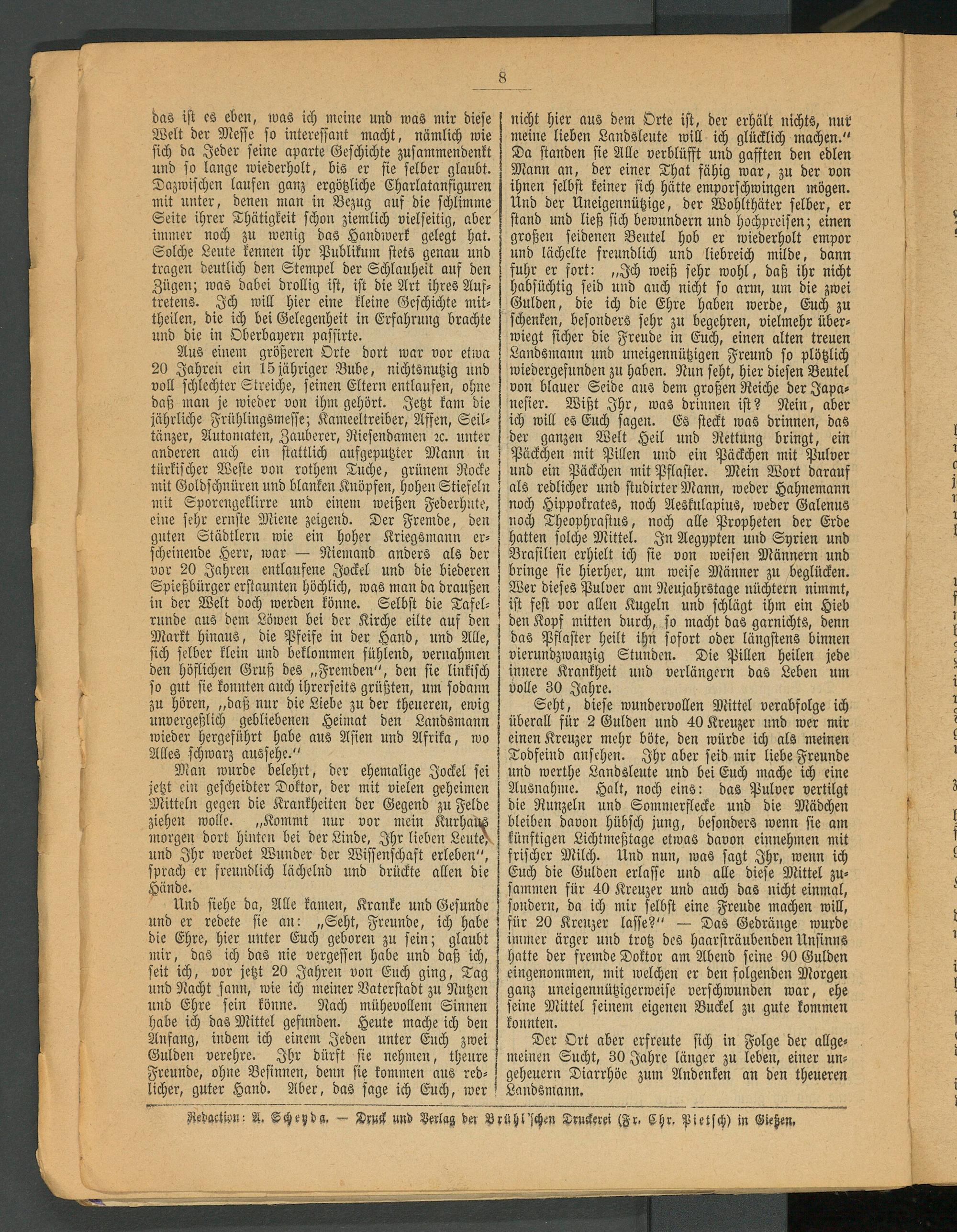 nicht hier aus dem Orte ist, der erhält nichts, nur meine lieben Landsleute will ich glücklich machen." Da standen sie Alle verblüfft und gafften den edlen Mann an, der einer That fähig war, zu der von ihnen selbst keiner sich hätte emporschwingen mögen. Und der Uneigennützige, der Wohlthäter selber, er stand und ließ sich bewundern und Hochpreisen; einen großen seidenen Beutel hob er wiederholt empor und lächelte freundlich und liebreich milde, dann fuhr er fort: „Ich weiß sehr wohl, daß ihr nicht habsüchtig seid und auch nicht so arm, um die zwei Gulden, die ich die Ehre haben werde, Euch zu schenken, besonders sehr zu begehren, vielmehr überwiegt sicher die Freude in Euch, einen alten treuen Landsmann und uneigennützigen Freund so plötzlich wiedergefunden zu haben. Nun seht, hier diesen Beutel von blauer Seide aus dem großen Reiche der Japa- nesier. Wißt Ihr, was drinnen ist? Nein, aber ich will es Euch sagen. Es steckt was drinnen, das der ganzen Welt Heil und Rettung bringt, ein Päckchen mit Pillen und ein Päckchen mit Pulver und ein Päckchen mit Pflaster. Mein Wort darauf als redlicher und studirter Mann, weder Hahnemann noch Hippokrates, noch Aesknlapius, weder Galenus noch Theophrastus, noch alle Propheten der Erde hatten solche Mittel. In Aegypten und Syrien und Brasilien erhielt ich sie von weisen Männern und bringe sie hierher, um weise Männer zu beglücken. Wer dieses Pulver am Neujahrstage nüchtern nimmt, ist fest vor allen Kugeln und schlägt ihm ein Hieb den Kopf mitten durch, so macht das garnichts, denn das Pflaster heilt ihn sofort oder längstens binnen vierundzwanzig Stunden. Die Pillen heilen jede innere Krankheit und verlängern das Leben um volle 30 Jahre.