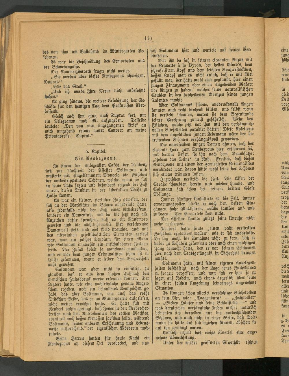 Soltmann war aber nicht so einfältig, zu glauben, daß er aus dem bloßen Fußmaß den identischen Fußabdruck werde erkennen können. Der Letztere hatte, wie eine nachträgliche genaue Augenschau ergeben, noch ein besonderes Kennzeichen gehabt, das aber Soltmann, wie auch das rothe Stückchen Seide, das er im Wintergarten ausgelesen, nicht weiter erwähnt hatte. Er hatte sich mit Neubert dahin geeinigt, daß Jener in den Verbrecherkreisen nach den Antccedentien des rothen Mathies, eventuell nach dessen Genossen forschen sollte, während Soltmann, seiner anderen Erscheinung und Lebensweise entsprechend, der eigentlichen Mörderin nachspürte.