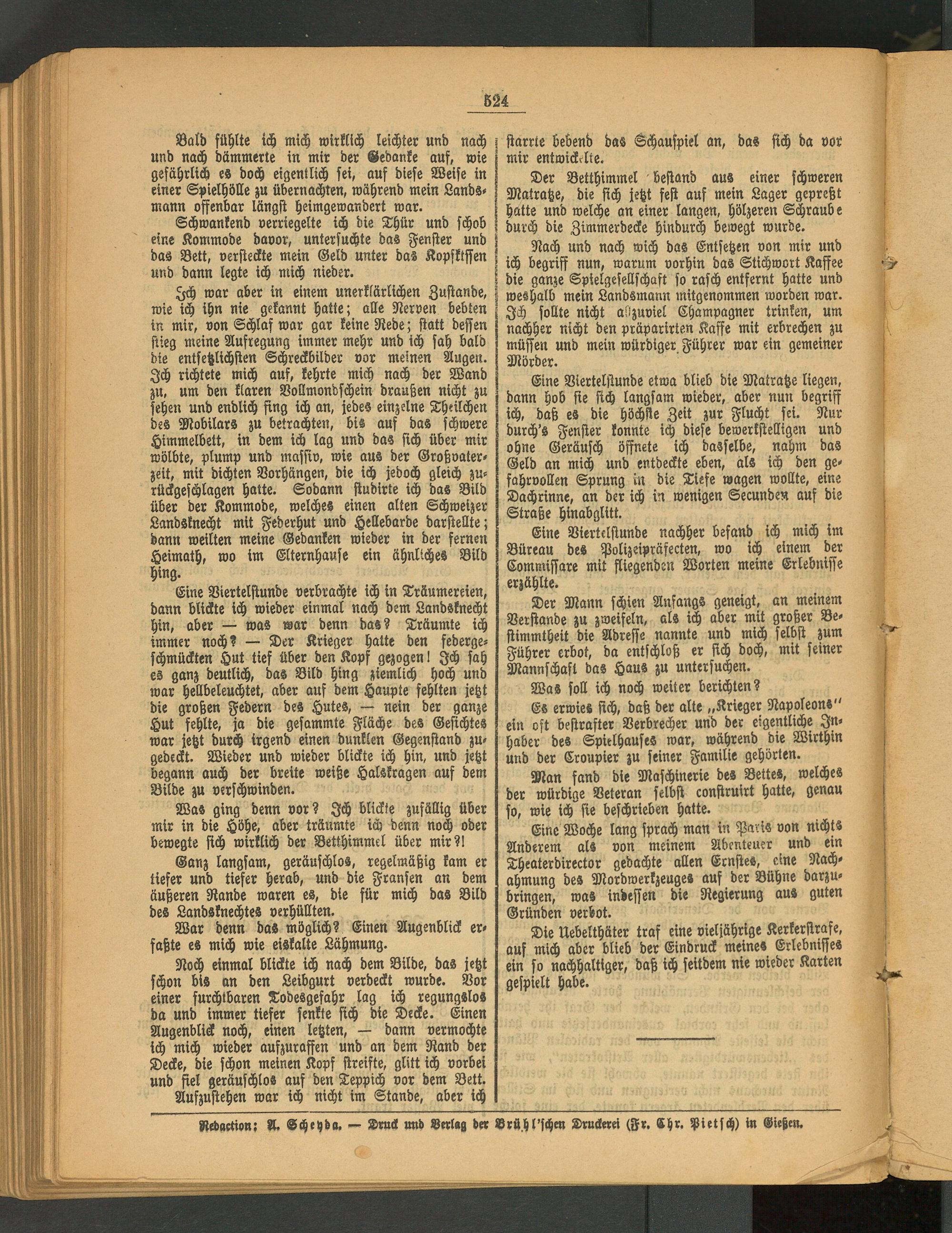Nach und nach wich das Entsetzen von mir und s ich begriff nun, warum vorhin das Stichwort Kaffee s die ganze Spielgesellschaft so rasch entfernt hatte und - weshalb mein Landsmann mitgenommen worden war. Ich sollte nicht aOzuviel Champagner trinken, um nachher nicht den präparirten Kaffe mit erbrechen zu müssen und mein würdiger Führer war ein gemeiner Mörder.