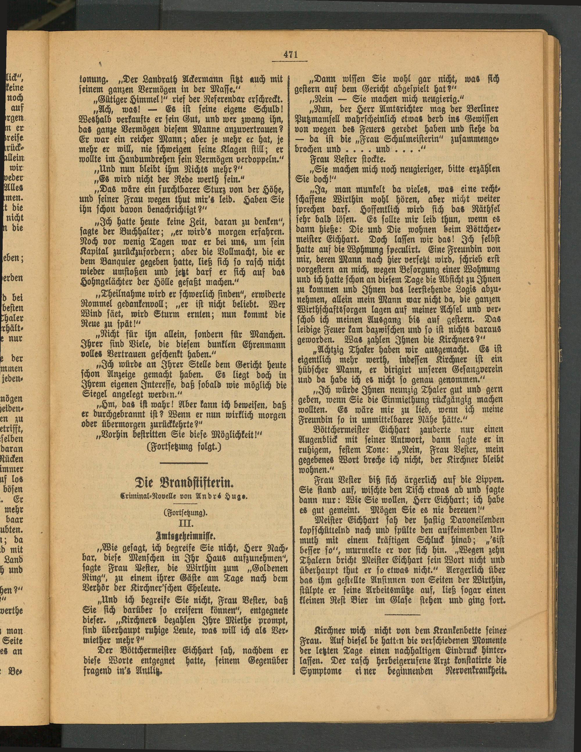 „Wie gesagt, ich begreife Sie nicht, Herr Nachbar, diese Menschen in Ihr Haus aufzunehmen", sagte Frau Bester, die Wirthin zum „Goldenen Ring", zu einem ihrer Gäste am Tage nach dem Verhör der Kirchner'schen Eheleute.