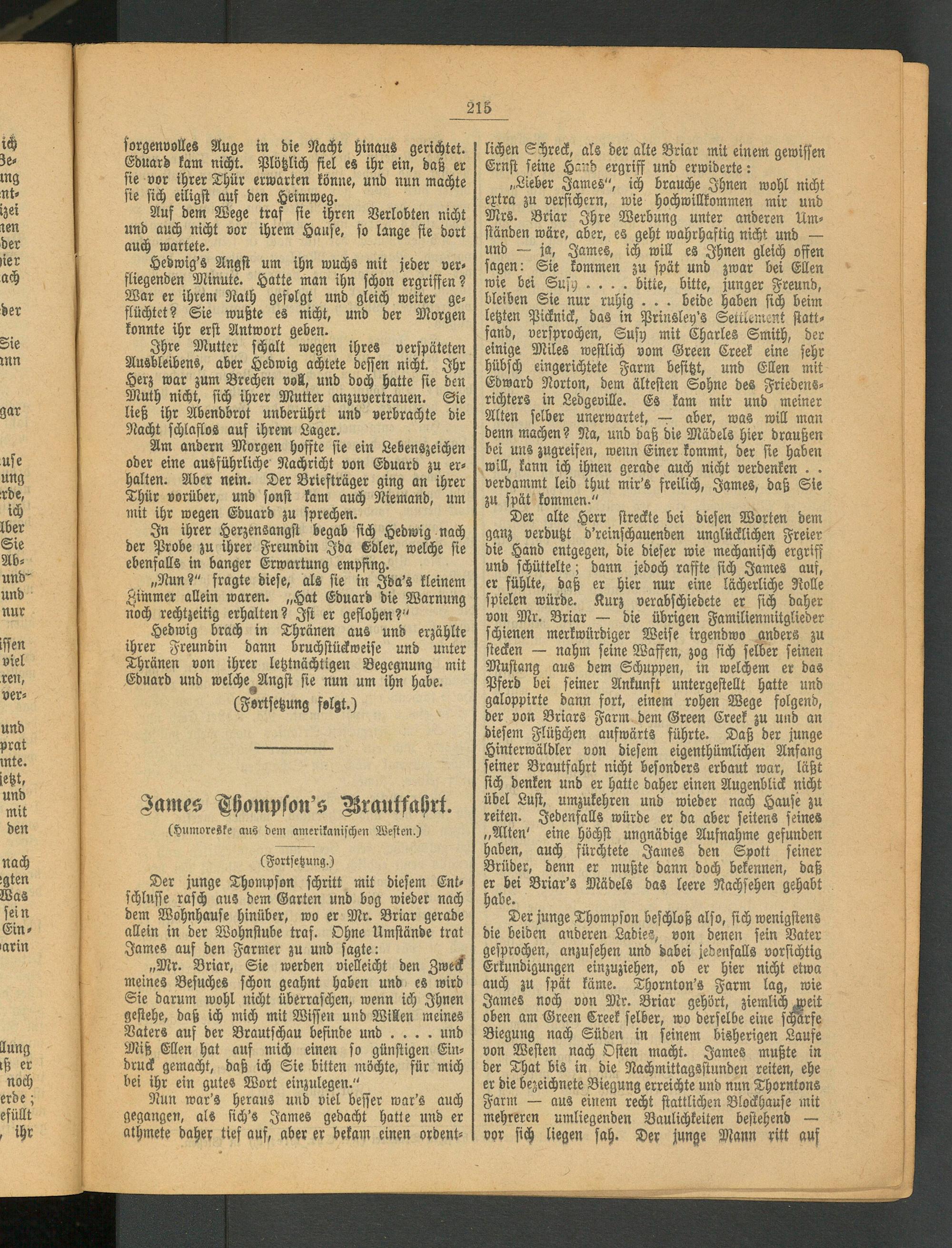 Der junge Thompson schritt mit diesem Ent- schluffe rasch aus dem Garten und bog wieder nach dem Wohnhause hinüber, wo er Mr. Briar gerade allein in der Wohnstube traf. Ohne Umstände trat James auf den Farmer zu und sagte: