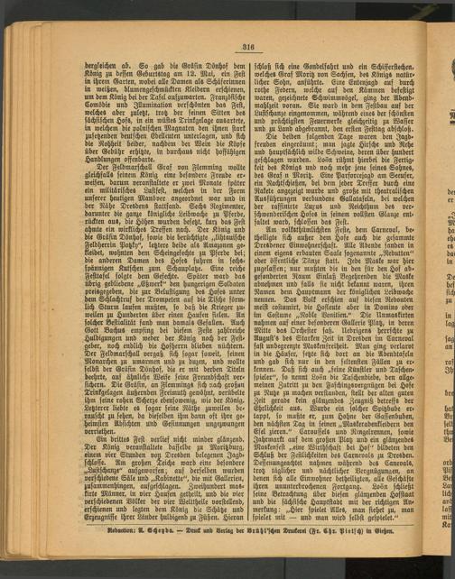 dergleichen ab. So gab die Gräfin Dönhof dem König zu deffen Geburtstag am 12. Mai, ein Fest in ihrem Garten, wobei alle Damen als Schäferinnen in weißen, blumengeschmückten Kleidern erschienen, um dem König bei der Tafel aufzuwarten. Französische Comödie und Illumination verschönten das Fest, welches aber zuletzt, trotz der feinen Sitten des sächsischen Hofs, in ein wüstes Trinkgelage ausartete, in welchem die polnischen Magnaten den ihnen stark zusetzenden deutschen Edelleuten unterlagen, und sich die Rohheit beider, nachdem der Wein die Köpfe über Gebühr erhitzte, in durchaus nicht hoffähigen Handlungen offenbarte.
