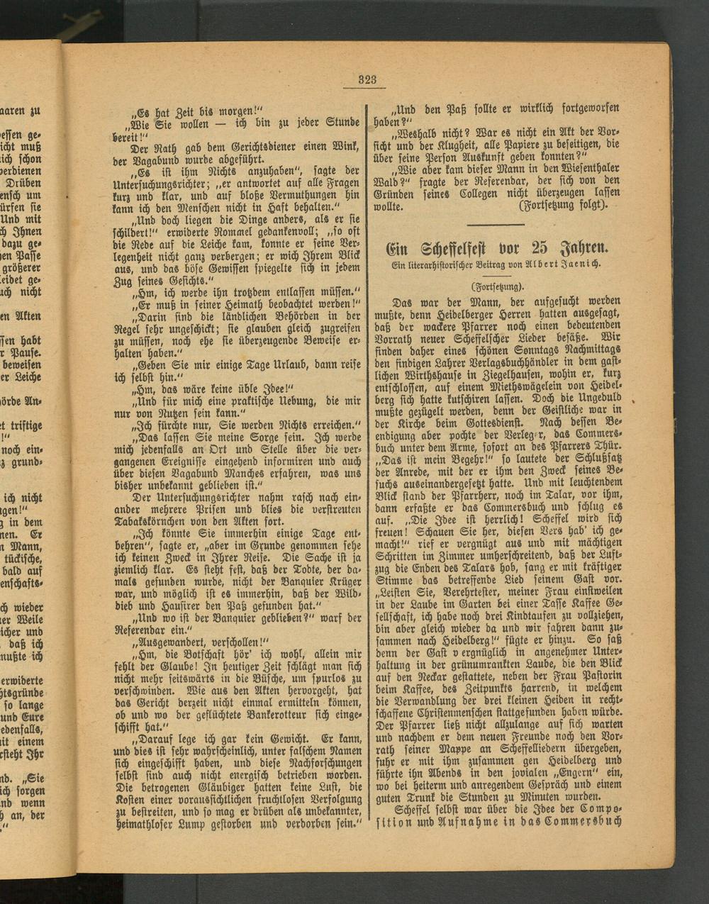 Das war der Mann, der aufgesucht werden mußte, denn Heidelberger Herren hatten ausgesagt, daß der wackere Pfarrer noch einen bedeutenden Vorrath neuer Scheffelscher Lieder besäße. , Wir finden daher eines schönen Sonntags Nachmittags den findigen Lahrer Verlagsbuchhändler in dem gastlichen Wirthshause in Ziegelhausen, wohin er, kurz entschloffen, auf einem Miethswägelein von Heidelberg sich hatte kutschiren laffen. Doch die Ungeduld mußte gezügelt werden, denn der Geistliche war in der Kirche beim Gottesdienst. Nach dessen Beendigung aber pochte der Verleger, das Commers« buch unter dem Arme, sofort an des Pfarrers Thür. „Das ist mein Begehr!" so lautete der Schlußsatz der Anrede, mit der er ihm den Zweck seines Besuchs auseinandergesetzt hatte. Und mit leuchtendem Blick stand der Pfarrherr, noch im Talar, vor ihm, dann erfaßte er das Commersbuch und schlug es auf. „Die Idee ist herrlich! Scheffel wird sich freuen! Schauen Sie her, diesen Vers hab' ich gemacht!" rief er vergnügt aus und mit mächtigen Schritten im Zimmer umherschreitend, daß der Luftzug die Enden des Talars hob, sang er mit kräftiger Stimme das betreffende Lied seinem Gast vor. „Leisten Sie, Verehrtester, meiner Frau einstweilen in der Laube im Garten bei einer Taffe Kaffee Gesellschaft, ich habe noch drei Kindtaufen zu vollziehen, bin aber gleich wieder da und wir fahren dann zusammen nach Heidelberg!" fügte er hinzu. So saß denn der Gast v ergnüglich in angenehmer Unterhaltung in der grünumrankten Laube, die den Blick auf den Neckar gestattete, neben der Frau Pastorin beim Kaffee, des Zeitpunkts harrend, in welchem die Verwandlung der drei kleinen Heiden in rechtschaffene Christenmenschen stattgefunden haben würde. Der Pfarrer ließ nicht allzulange auf sich warten und nachdem er dem neuen Freunde noch den Vorrath seiner Mappe an Scheffelliedern übergeben, fuhr er mit ihm zusammen gen Heidelberg und führte ihn Abends in den jovialen „Engem" ein, wo bei heiterm und anregendem Gespräch und einem guten Trunk die Stunden zu Minuten wurden.
