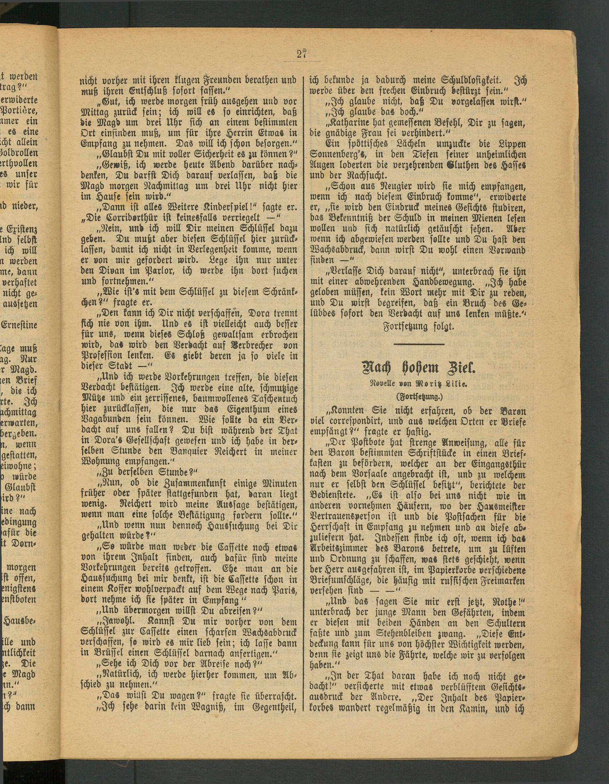 „Den kann ich Dir nicht verschaffen, Dora trennt sich nie von ihm. Und es ist vielleicht auch bester für uns, wenn dieses Schloß gewaltsam erbrochen wird, das wird den Verdacht auf Verbrecher von Profession lenken. Er giebt deren ja so viele in dieser Stadt —"