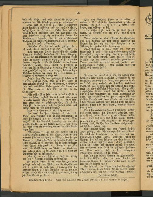 „Das Mädchen ist jung, schön und, was die Hauptsache ist, reich — für mich die bedeutungsvollste Eigenschaft", sagte der junge Mann zu sich selbst, als er sich allein befand, „hier gilt es rasch zu handeln, ehe ein anderer Bewerber zuvorkommt. Darum vorwärts, gleichviel ob auf geraden ober verschlungenen Wegen — dem Kühnen war da» Glück noch immer hold!"