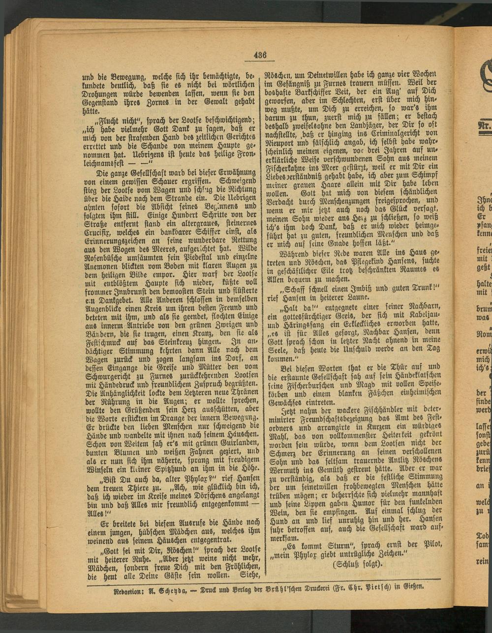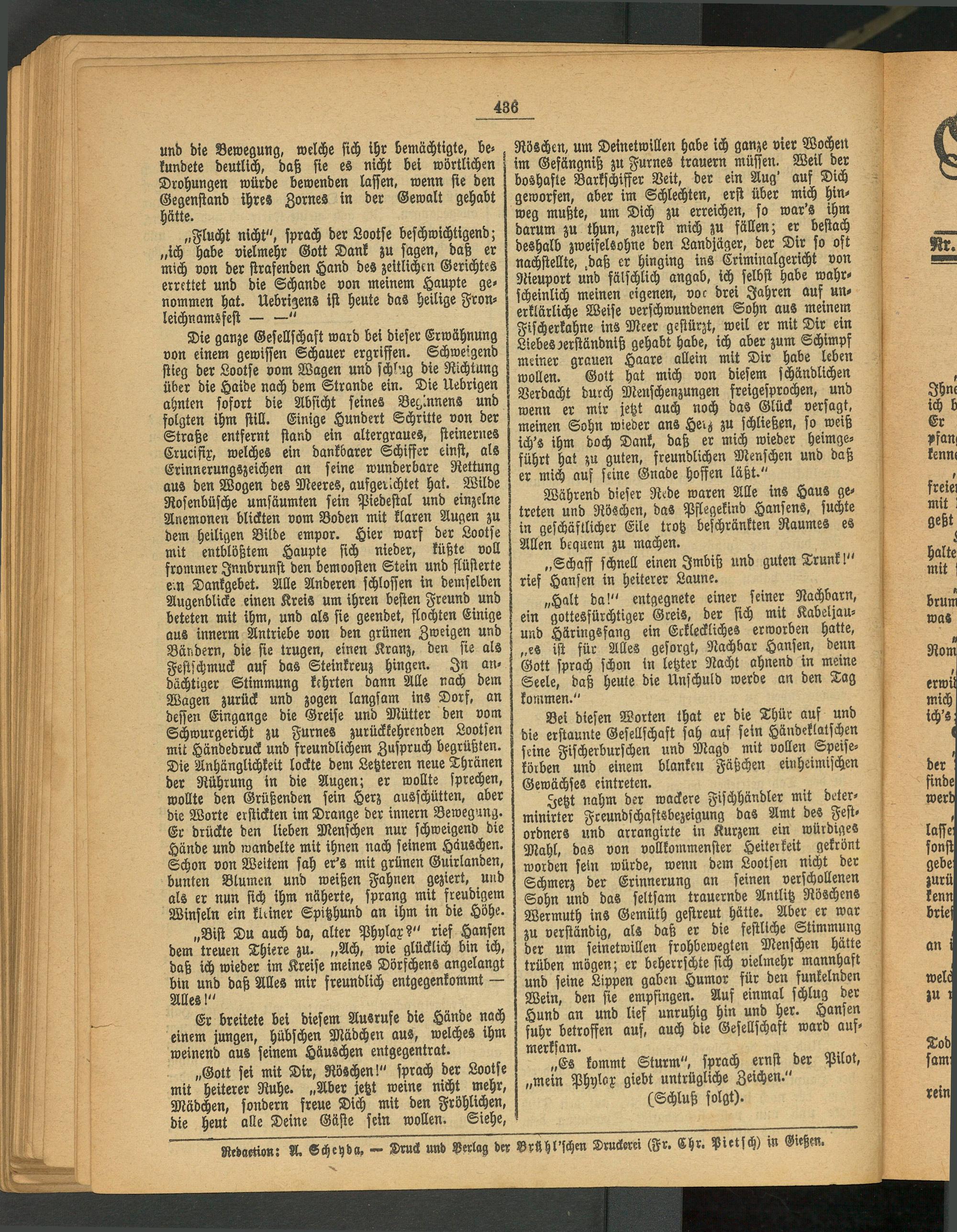 „Halt da!" entgegnete einer seiner Nachbarn, ein gottesfürchtiger Greis, der sich mit Kabeljau- und Häringsfang ein Erkleckliches erworben hatte, „es ist für Alles gesorgt, Nachbar Hansen, denn Gott sprach schon in letzter Nacht ahnend in meine Seele, daß heute die Unschuld werde an den Tag kommen."