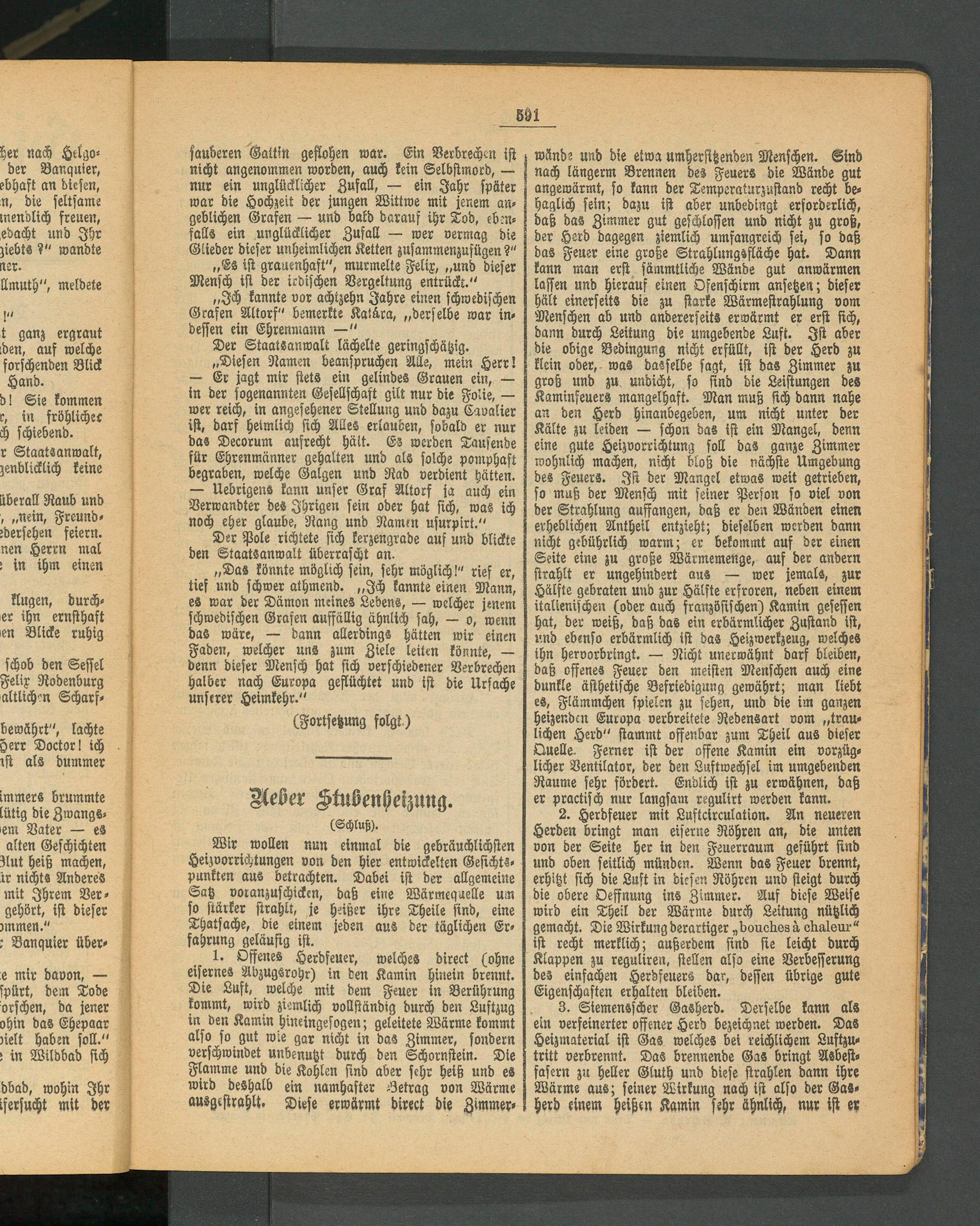 2. Herdfeuer mit Luftcirculation. An neueren Herden bringt man eiserne Röhren an, die unten von der Seite her in den Feuerraum geführt sind und oben seitlich münden. Wenn das Feuer brennt, erhitzt sich die Lust in diesen Röhren und steigt durch die obere Oeffnung ins Zimmer. Auf diese Weise wird ein Theil der Wärme durch Leitung nützlich gemacht. Die Wirkung derartiger „bouches ä chaleur“ ist recht merklich; außerdem sind sie leicht durch Klappen zu reguliren, stellen also eine Verbesserung des einfachen Herdfeuers dar, dessen übrige gute Eigenschaften erhalten bleiben.