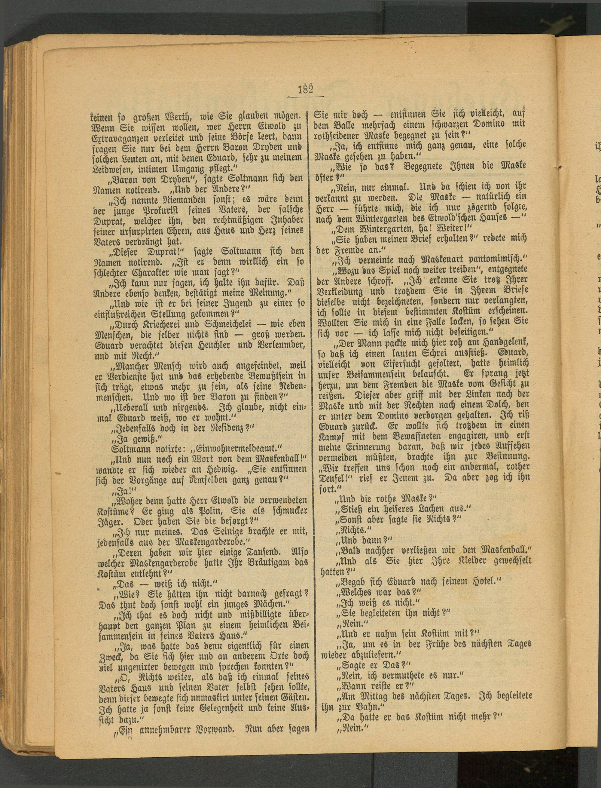 „O, Nichts weiter, als daß ich einmal seines Vaters Haus und seinen Vater selbst sehen sollte, denn dieser bewegte sich unmaskirt unter seinen Gästen. Ich hatte ja sonst keine Gelegenheit und keine Aussicht dazu."