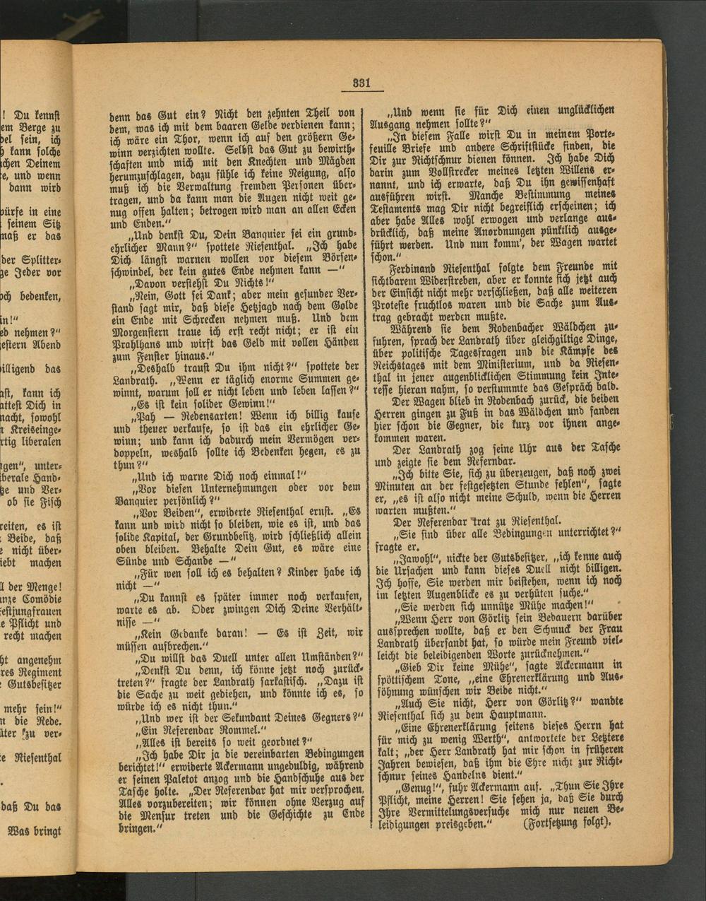 Während sie dem Rodenbacher Wäldchen zufuhren, sprach der Landrath über gleichgiltige Dinge, über politische Tagesfragen und die Kämpfe des Reichstages mit dem Ministerium, und da Riesenthal in jener augenblicklichen Stimmung kein Inte- reffe hieran nahm, so verstummte das Gespräch bald.