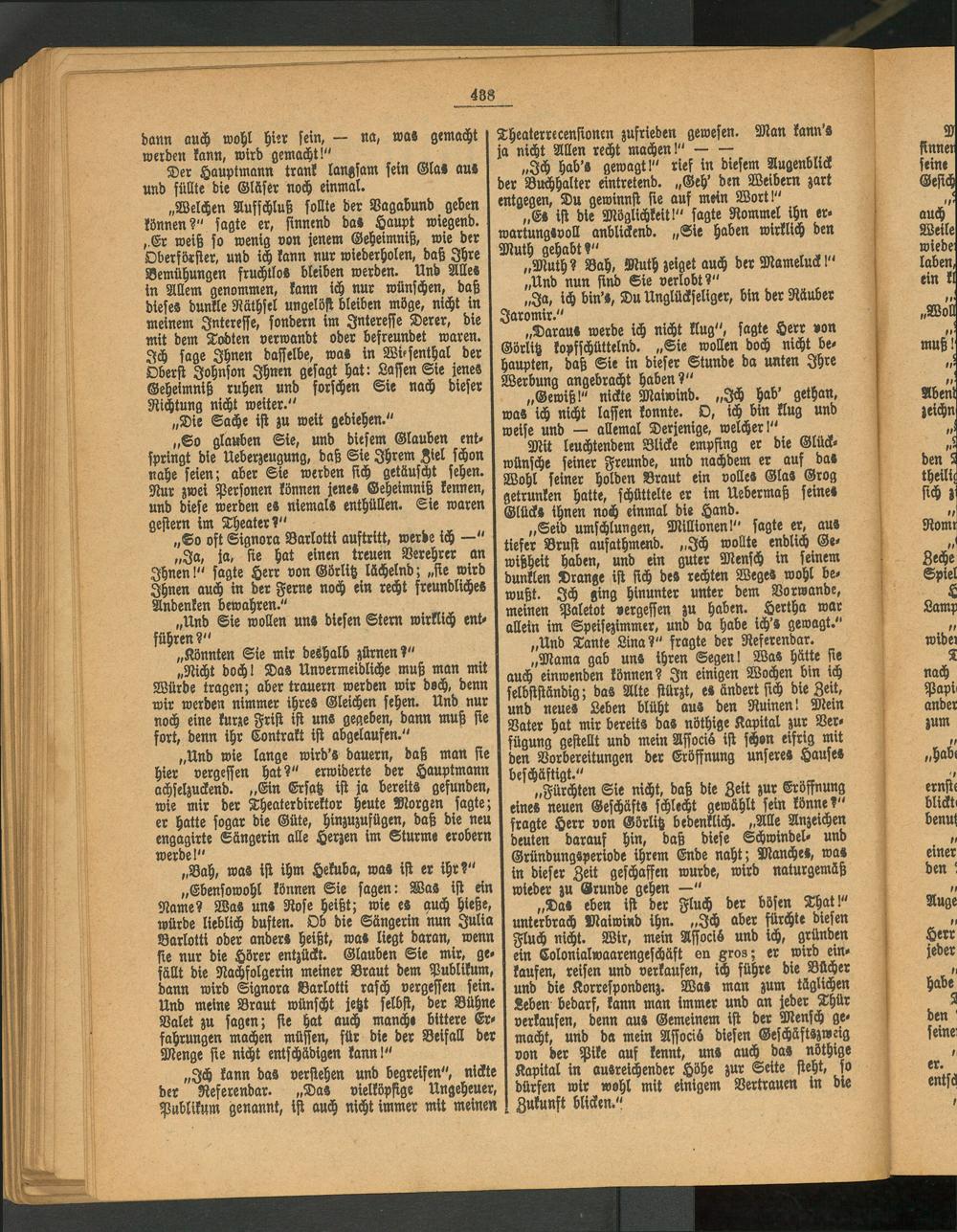 „Mama gab uns ihren Segen I Was hätte sie auch einwenden können? In einigen Wochen bin ich selbstständig; das Alte stürzt, es ändert sich die Zeit, und neues Leben blüht aus den Ruinen! Mein Vater hat mir bereits das nöthige Kapital zur Verfügung gestellt und mein Associä ist schon eifrig mit den Vorbereitungen der Eröffnung unseres Hauses beschäftigt."