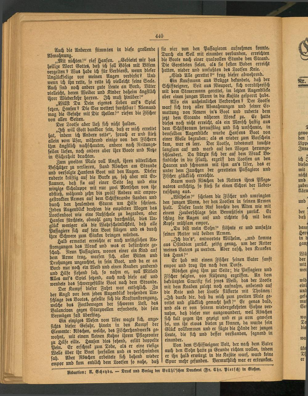 „Ich will Gott dankbar sein, daß er mich errettet hat, indem ich Andere rette", sprach er und stieß allein vom Ufer, während einige von den Fischern ihm ängstlich nachschauten, andere nach Rettungs- seilen liefen, noch andere aber ihre Boote und Netze in Sicherheit brachten.