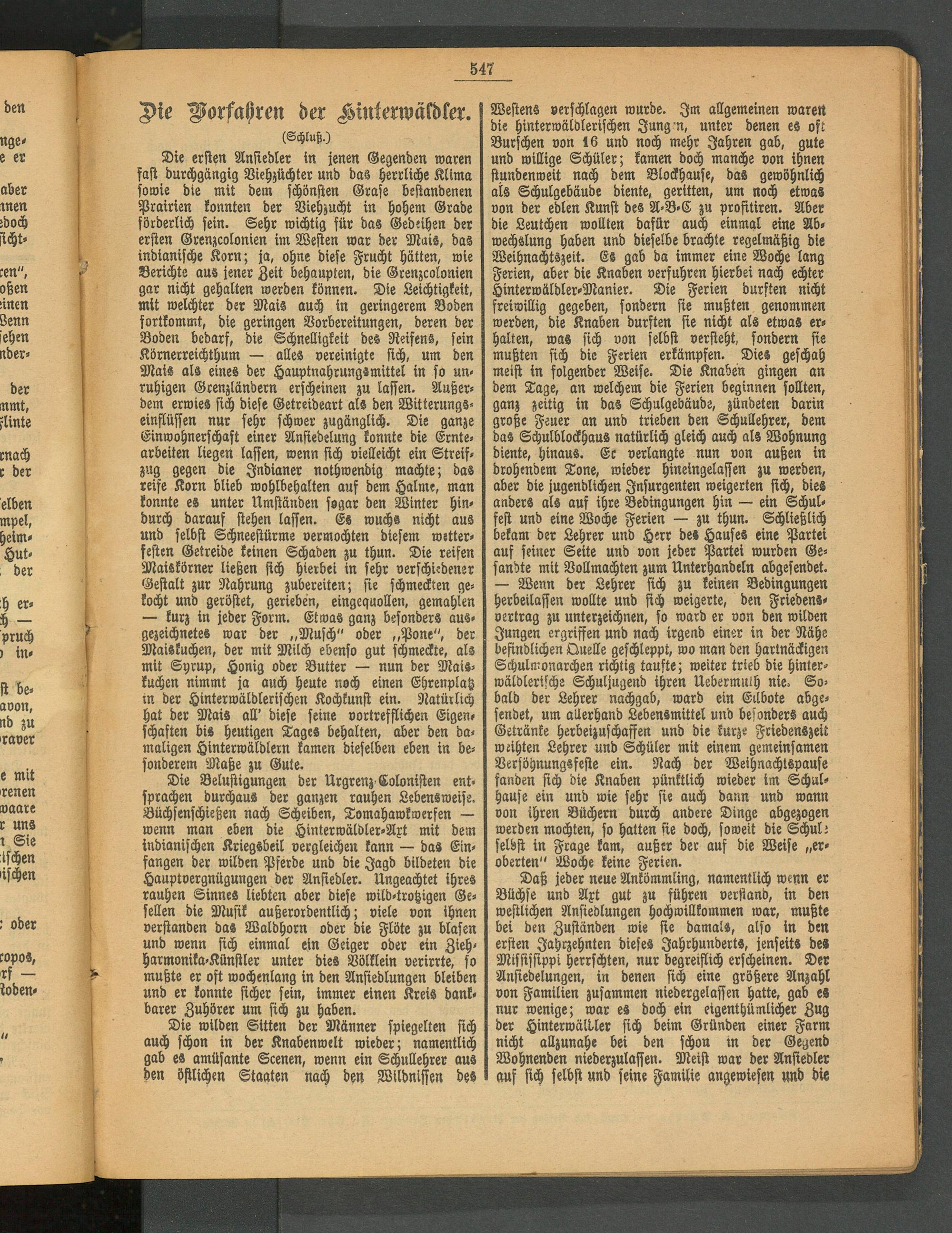 Die ersten Ansiedler in jenen Gegenden waren fast durchgängig Viehzüchter und das herrliche Klima sowie die mit dem schönsten Grase bestandenen Prairien konnten der Viehzucht in hohem Grade förderlich sein. Sehr wichtig für das Gedeihen der ersten Grenzcolonien im Westen war der Mais, das indianische Korn; ja, ohne diese Frucht hätten, wie Berichts aus jener Zeit behaupten, die Grenzcolonien gar nicht gehalten werden können. Die Leichtigkeit, mit welchter der Mais auch in geringerem Boden fortkommt, die geringen Vorbereitungen, deren der Boden bedarf, die Schnelligkeit des Reifens, sein Körnerreichthum — alles vereinigte sich, um den Mais als eines der Hauptnahrungsmittel in so unruhigen Grenzländern erscheinen zu lassen. Außerdem erwies sich diese Getreideart als den Witterungs- einflüssen nur sehr schwer zugänglich. Die ganze Einwohnerschaft einer Ansiedelung konnte die Ernte, arbeiten liegen lassen, wenn sich vielleicht ein Streifzug gegen die Indianer nothwendig machte; das reife Korn blieb wohlbehalten auf dem Halme, man konnte es unter Umständen sogar den Winter hindurch darauf stehen lassen. E« wuchs nicht aus und selbst Schneestürme vermochten diesem wetterfesten Getreide keinen Schaden zu thun. Die reifen Maiskörner ließen sich hierbei in sehr verschiedener Gestalt zur Nahrung zubereiten; sie schmeckten gekocht und geröstet, gerieben, eingequollen, gemahlen — kurz in jeder Form. Etwas ganz besonders ausgezeichnetes war der „Musch" oder „Pone", der Maiskuchen, der mit Milch ebenso gut schmeckte, als mit Syrup, Honig oder Butter — nun der Maiskuchen nimmt ja auch heute noch einen Ehrenplatz rn der Hinterwäldlerischen Kochkunst ein. Natürlich hat der Mais all' diese seine vortrefflichen Eigenschaften bis heutigen Tages behalten, aber den damaligen Hinterwäldlern kamen dieselben eben in besonderem Maße zu Gute.
