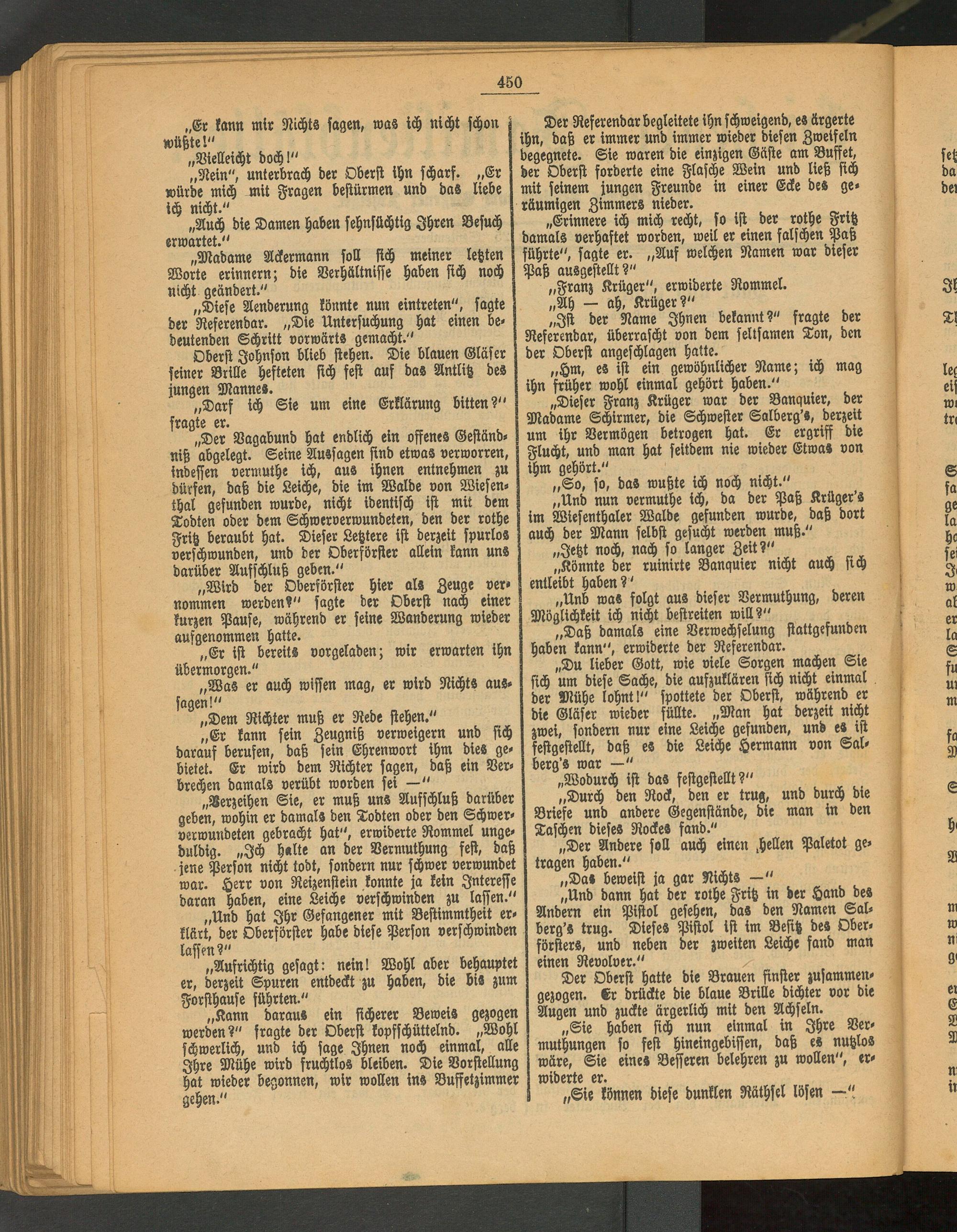„Und nun vermuthe ich, da der Paß Krüger's im Wiesenthaler Walde gefunden wurde, daß dort auch der Mann selbst gesucht werden muß."