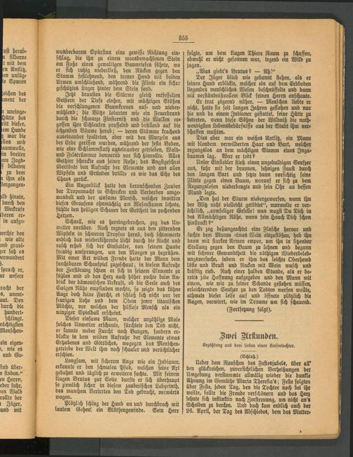 Er trat zögernd näher, — Menschen liebte er nicht, hatte sie seit langen Jahren geflohen und nur hie und da einem Indianer gestattet, seine Hütte zu betreten, wenn diese Söhne der Wildniß die noth- wendigsten Lebensbedürfniße aus der Stadt ihm verschaffen mußten.