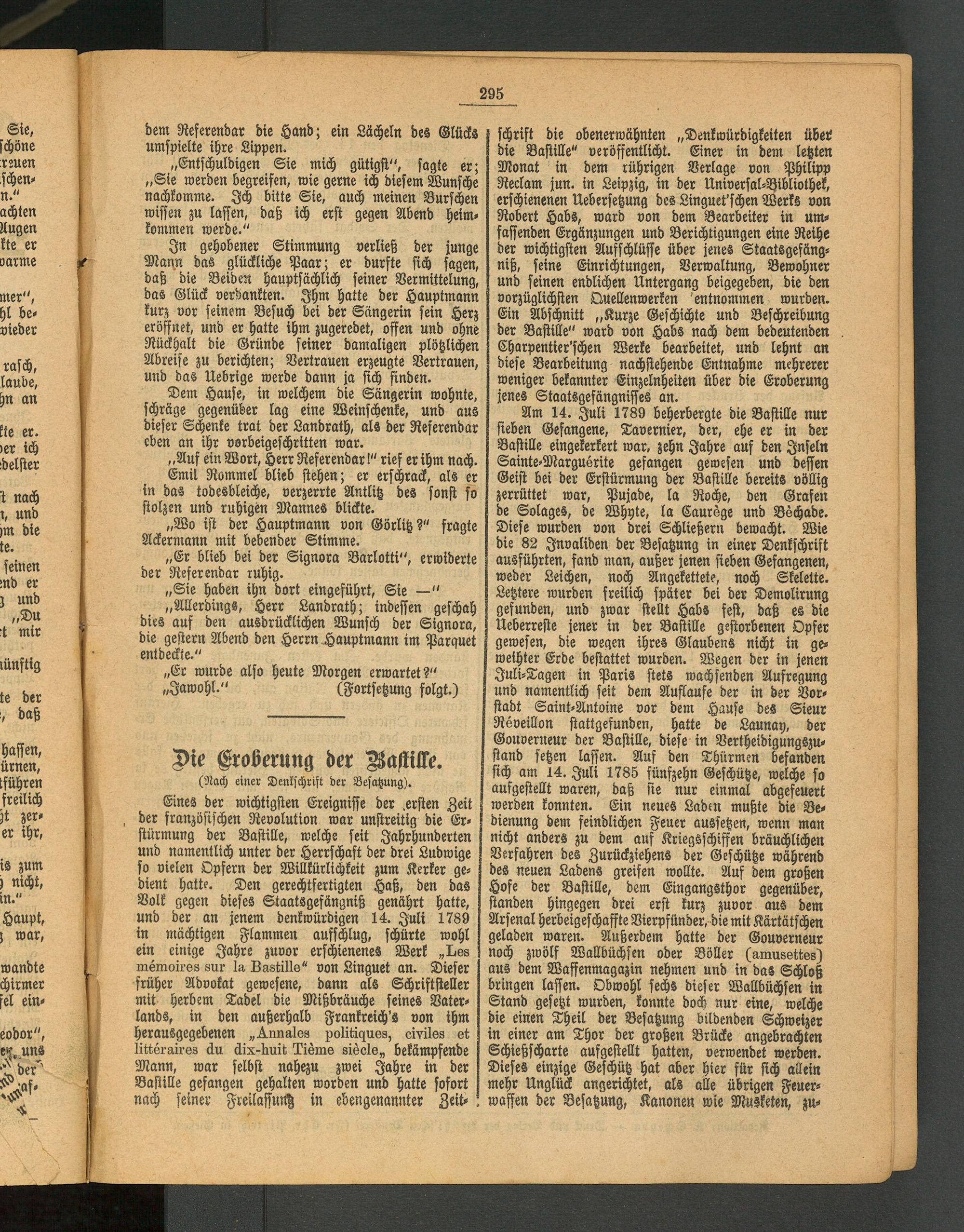schrift die obenerwähnten „Denkwürdigkeiten über die Bastille" veröffentlicht. Einer in dem letzten Monat in dem rührigen Verlage von Philipp Reclam jun. in Leipzig, in der Universal-Bibliothek, erschienenen Uebersetzung des Linguet'schen Werks von Robert Habs, ward von dem Bearbeiter in umfassenden Ergänzungen und Berichtigungen eine Reihe der wichtigsten Aufschlüsse über jenes Staatsgefängniß, seine Einrichtungen, Verwaltung, Bewohner und seinen endlichen Untergang beigegeben, die den vorzüglichsten Quellenwerken entnommen wurden. Ein Abschnitt „Kurze Geschichte und Beschreibung der Bastille" ward von Habs nach dem bedeutenden Charpentier'schen Werke bearbeitet, und lehnt an diese Bearbeitung nachstehende Entnahme mehrerer weniger bekannter Einzelnheiten über die Eroberung jenes Staatsgefängnifles an.