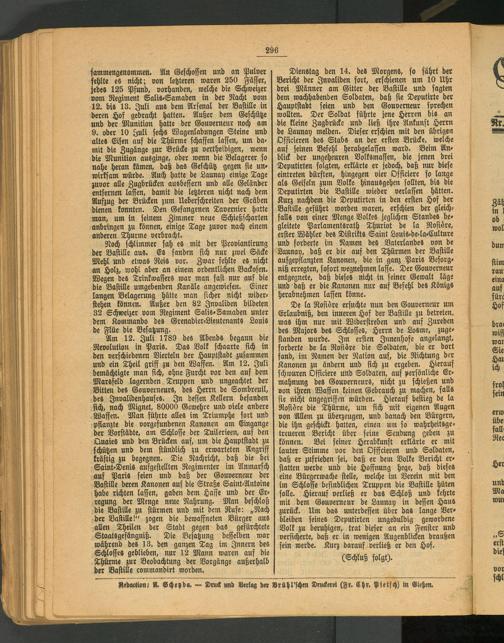 Am 12. Juli 1789 des Abends begann die Revolution in Paris. Das Volk schaarte sich in den verschiedenen Vierteln der Hauptstadt zusammen und ein Theil griff zu den Waffen. Am 12. Juli bemächtigte man sich, ohne Furcht vor den auf dem Marsfeld lagernden. Truppen und ungeachtet der Bitten des Gouverneurs, des Herrn de Sombreuil, des Jnvalidenhauses. In dessen Kellern befanden sich, nach Mignet, 80000 Gewehre und viele andere Waffen. Man führte alles im Triumphe fort und pflanzte die vorgefundenen Kanonen am Eingänge der Vorstädte, am Schlöffe der Tuilerieen, auf den Quaies und den Brücken auf, um die Hauptstadt zu schützen und dem stündlich zu erwarteten Angriff kräftig zu begegnen. Die Nachricht, daß die bei Saint-Denis aufgestellten Regimenter im Anmarsch auf Paris seien und daß der Gouverneur der Bastille deren Kanonen auf die Straße Saint-Antoine habe richten laffen, gaben dem Haffe und der Erregung der Menge neue Nahrung. Man beschloß die Bastille zu stürmen und mit dem Rufe: „Nach der Bastille!" zogen die bewaffneten Bürger aus allen Theilen der Stadt gegen das gefürchtete Staatsgefängniß. Die Besatzung deffelben war während des 13. den ganzen Tag im Innern des Schlaffes geblieben, nur 12 Mann waren auf die Thürme zur Beobachtung der Vorgänge außerhalb der Bastille commandirt worden.