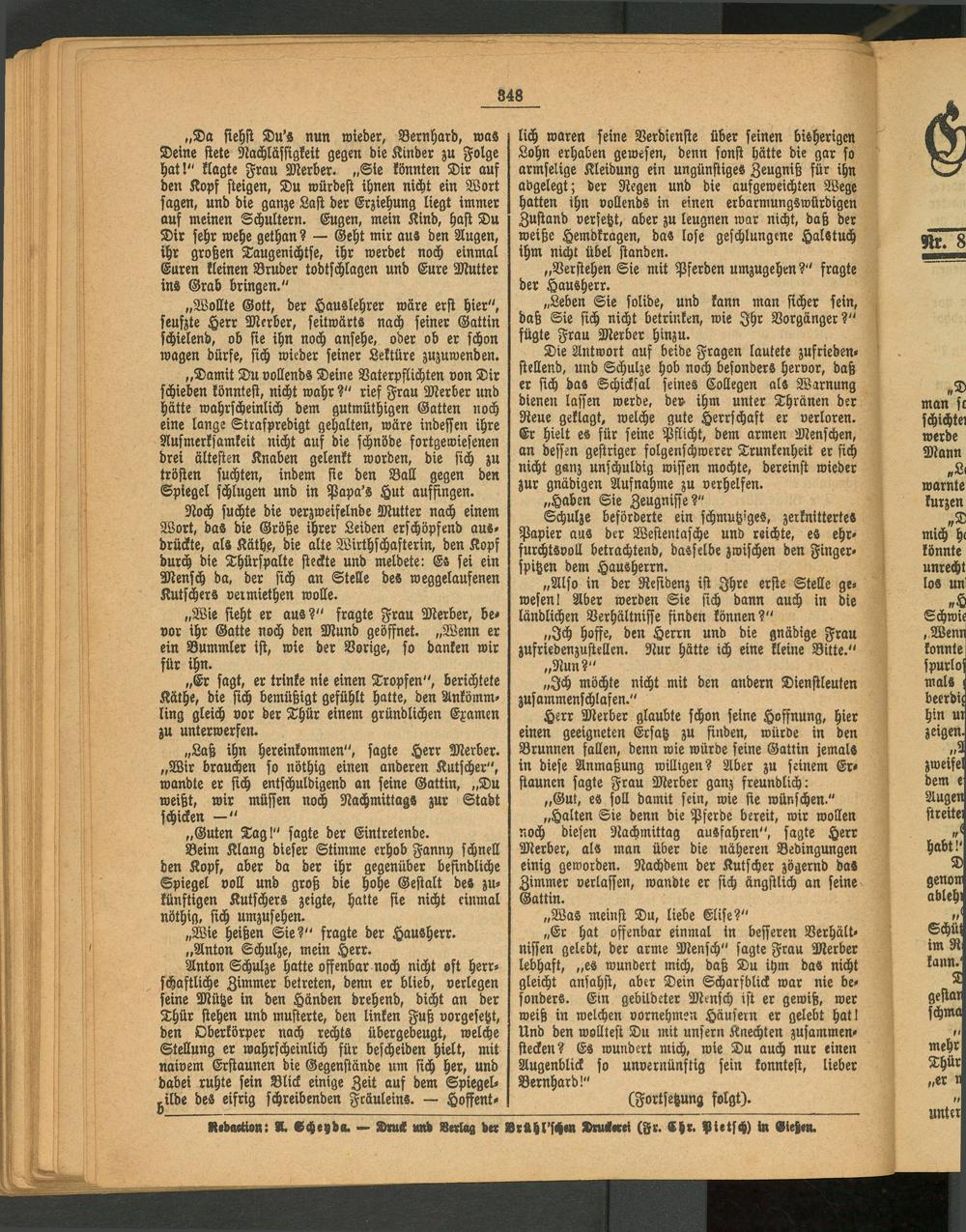 „Wollte Gott, der Hauslehrer wäre erst hier", seufzte Herr Merber, seitwärts nach seiner Gattin schielend, ob sie ihn noch ansehe, oder ob er schon wagen dürfe, sich wieder seiner Lektüre zuzuwenden.