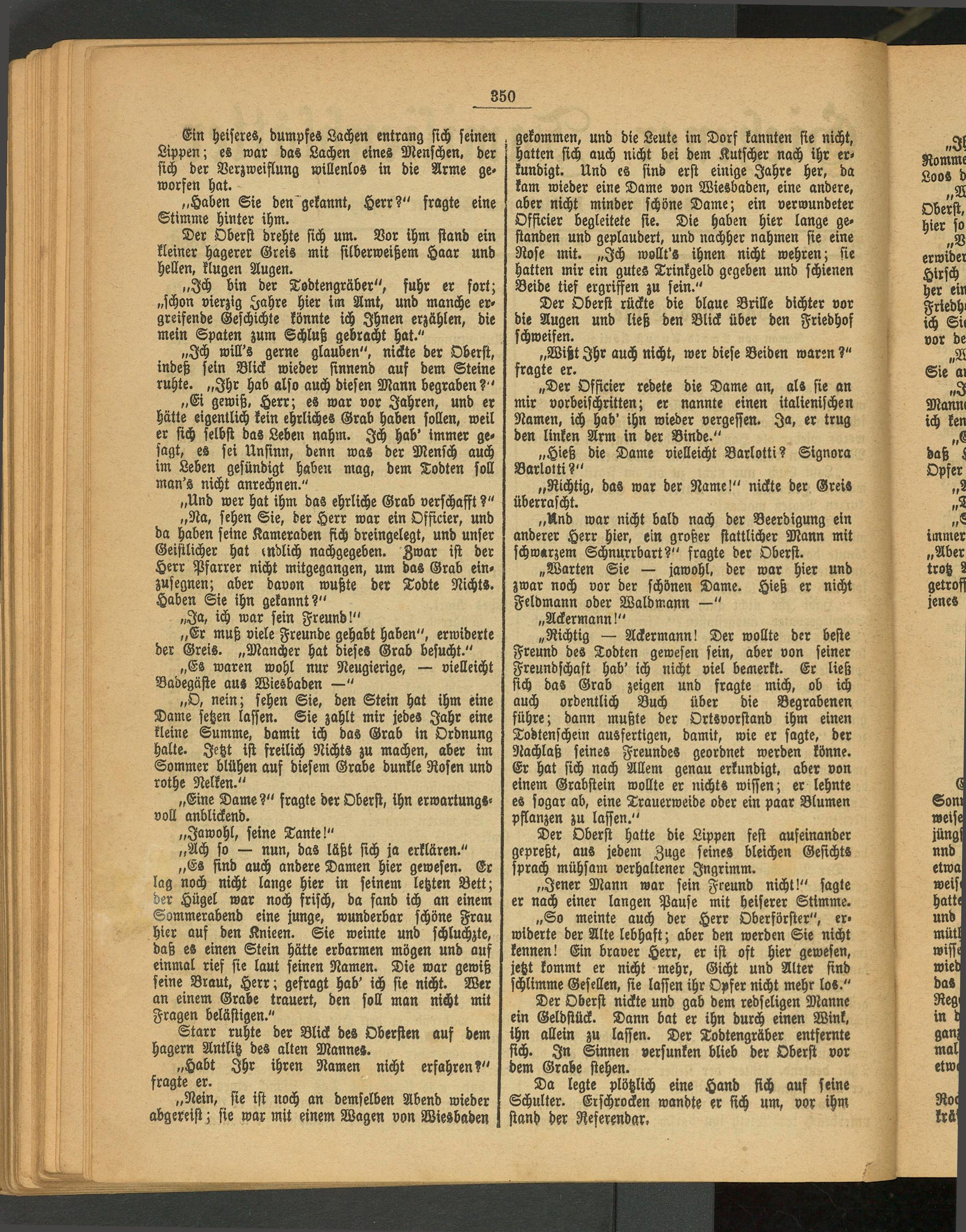 Der Oberst nickte und gab dem redseligen Manne ein Geldstück. Dann bat er ihn durch einen Wink, ihn allein zu lassen. Der Todtengräber entfernte sich. In Sinnen versunken blieb der Oberst vor dem Grabe stehen.