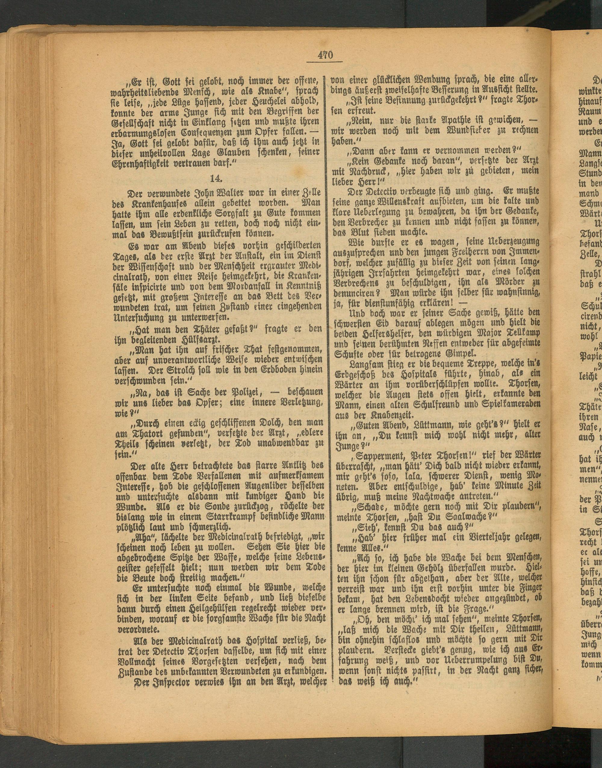 Als der Medicinalrath das Hospital verließ, betrat der Detectiv Thorsen dasselbe, um sich mit einer Vollmacht seine« Vorgesetzten versehen, nach dem Zustande des unbekannten Verwundeten zu erkundigen.