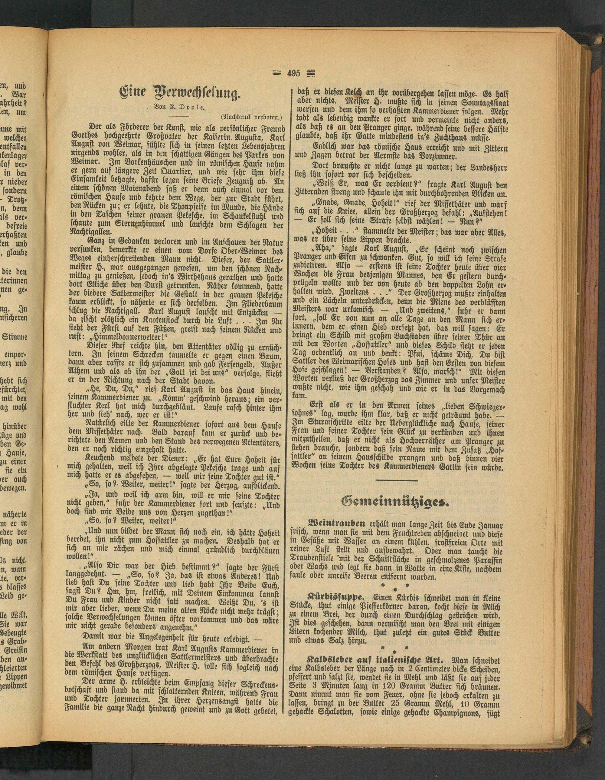„Gnade, Gnade, Hoheit!" rief der Miffethäter und warf sich auf die Kniee, allein der Großherzog befahl: „Aufstehen! — Er soll sich seine Strafe selbst wählen! — Nun?"