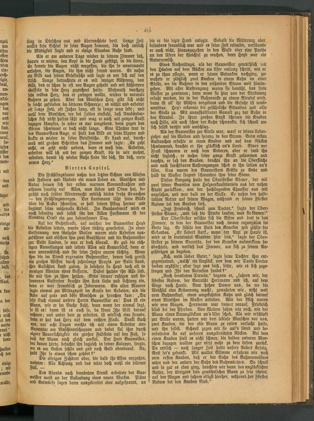Als der Baumeister zur Stelle war, warf er seinen lieber- zieher auf die Weiden und sprang in den Strom. Beim ersten Auftauchen erfaßte er einen Knaben und auf dem Rücken schwimmend, brachte er ihn glücklich an's Land. Starr vor Frost schwamm er nach dem Anderen, aber er fand ihn nicht sogleich, er nahm seine ganze Kraft zusammen und tauchte, er sah den Knaben, brachte ihn an die Oberfläche und nach furchtbaren Anstrengungen schob er ihn leblos an's Ufer. Nun waren des Baumeisters Kräfte zu Ende und halb im Wasser liegend schwanden ihm seine Sinne.