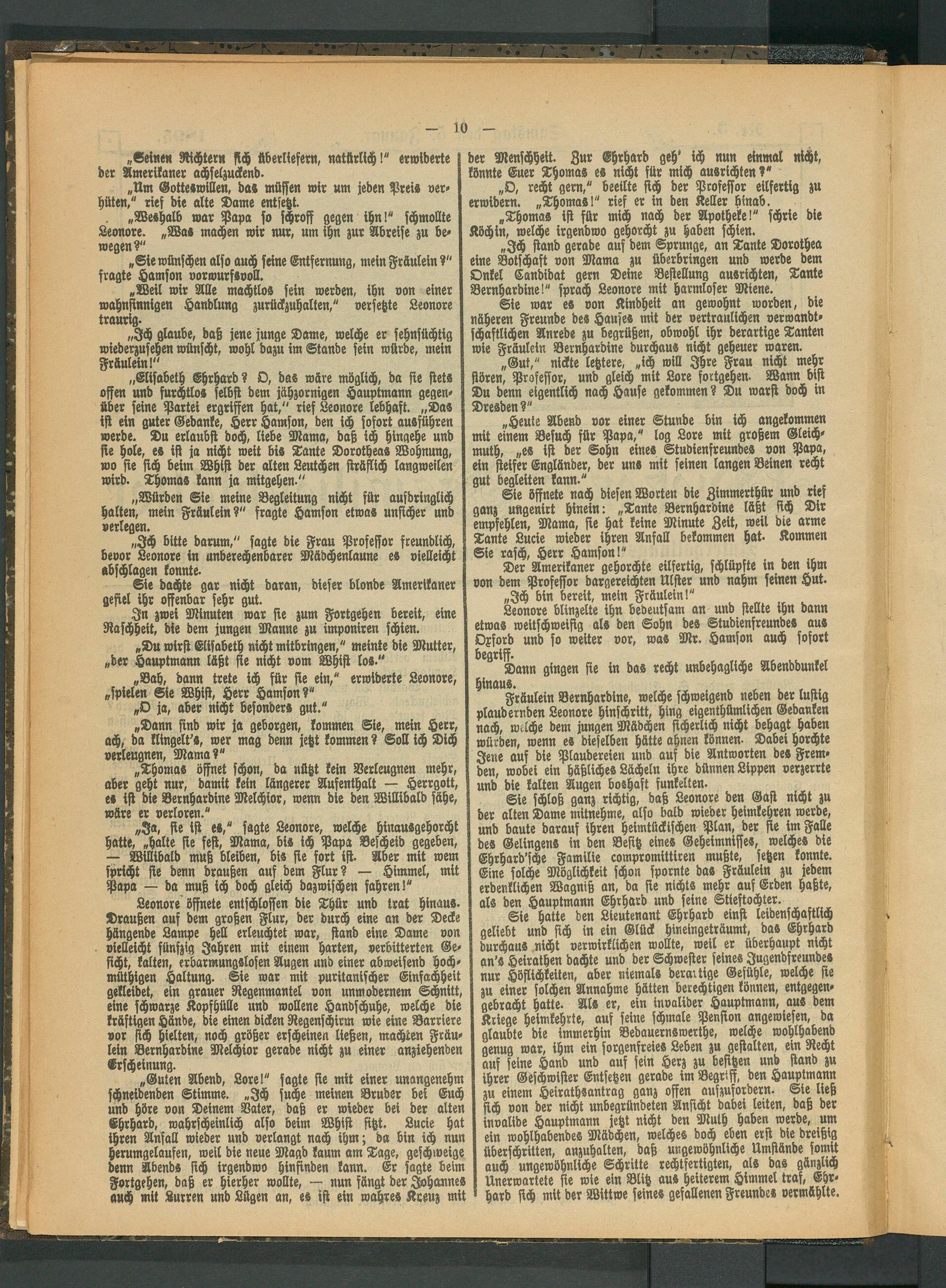 „Elisabeth Ehrhard? O, das wäre möglich, da sie stets offen und furchtlos selbst dem jähzornigen Hauptmann gegenüber seine Partei ergriffen hat," rief Leonore lebhaft. „Das ist ein guter Gedanke, Herr Hamson, den ich sofort auaführen werde. Du erlaubst doch, liebe Mama, daß ich hingehe und sie hole, es ist ja nicht weit bis Tante Dorotheas Wohnung, wo sie sich beim Whist der alten Leutchen sträflich langweilen wird. Thomas kann ja mitgehen."