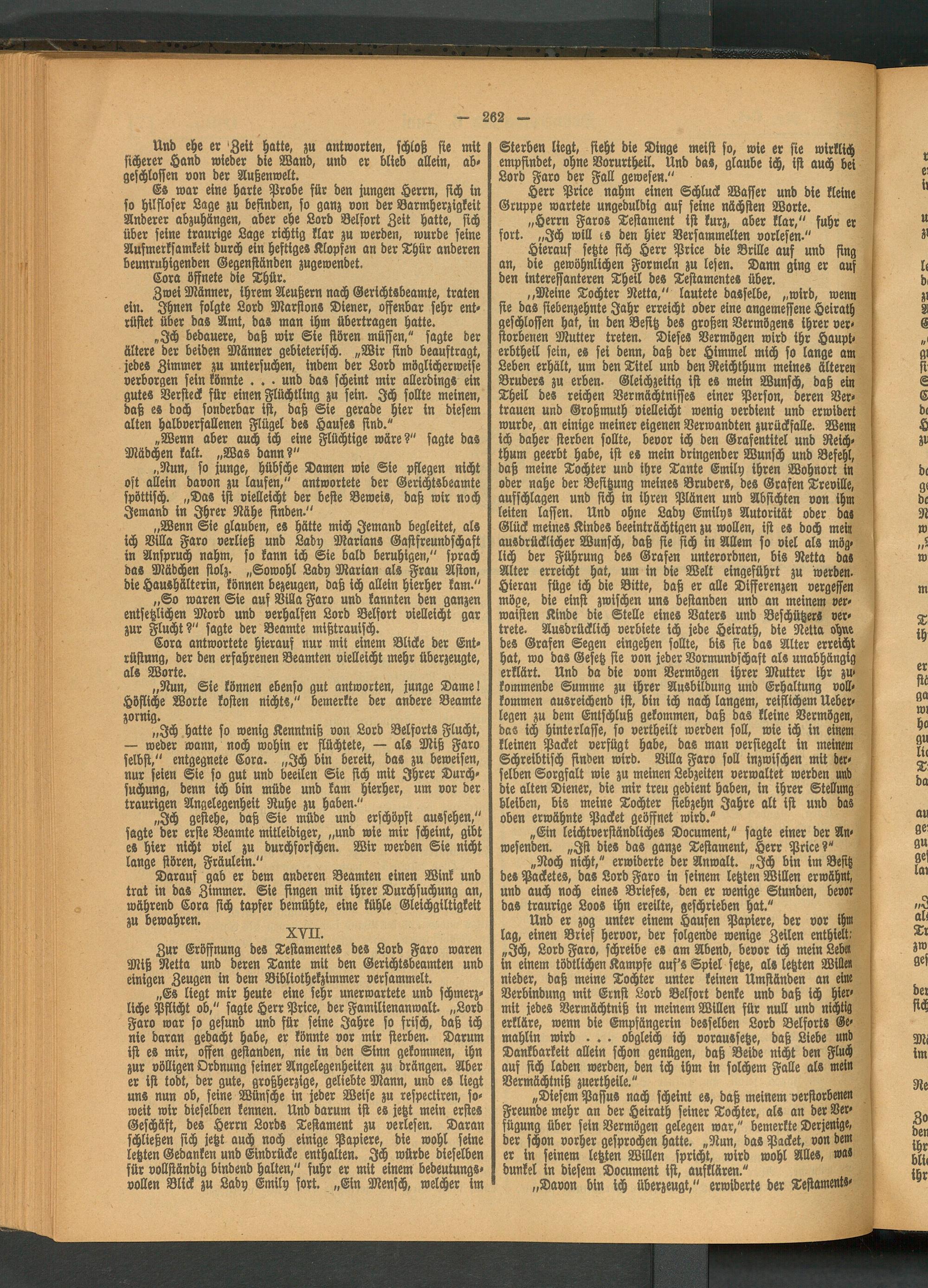 „Es liegt mir heute eine sehr unerwartete und schmerzliche Pflicht ob," sagte Herr Price, der Familienanwalt. „Lord Faro war so gesund und für seine Jahre so frisch, daß ich nie daran gedacht habe, er könnte vor mir sterben. Darum ist es mir, offen gestanden, nie in den Sinn gekommen, ihn zur völligen Ordnung seiner Angelegenheiten zu drängen. Aber er ist tobt, der gute, großherzige, geliebte Mann, und es liegt uns nun ob, feine Wünsche in jeder Weise zu respectiren, soweit wir dieselben kennen. Und darum ist es jetzt mein erstes Geschäft, des Herrn Lords Testament zu verlesen. Daran schließen sich jetzt auch noch einige Papiere, die wohl seine letzten Gedanken und Eindrücke enthalten. Ich würde dieselben für vollständig bindend halten," fuhr er mit einem bedeutungsvollen Blick zu Lady Emily fort. „Ein Mensch, welcher im
