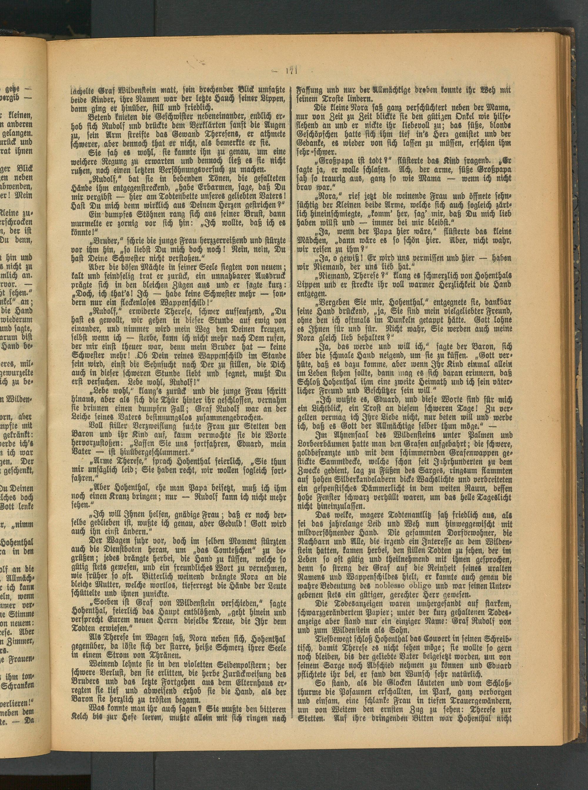 Die Todesanzeigen waren umhergesandt auf starkem, schwarzgerändertem Papier; unter der kurz gehaltenen Todesanzeige aber stand nur ein einziger Name: Gras Rudolf von und zum Wilden stein als Sohn.