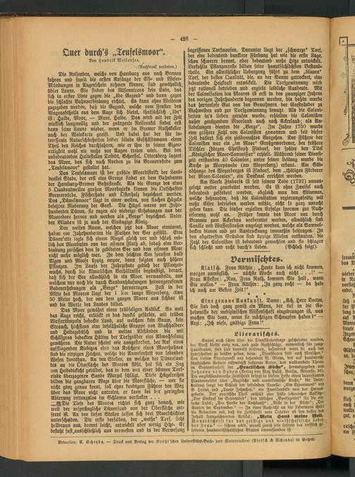 Die Reisenden, welche von Hamburg aus nach Bremen fahren und somit die ersten Anfänge der Elb- und Weser- Mündungen in Augenschein nehmen können, sind gewöhnlich übler Laune. Sie finden des Räsonnirens kein Ende, das sich in erster Linie gegen die „öde Gegend" und dann gegen die schlechte Bahnverbindung richtet. Es kann ohne Weiteres zugegeben werden, daß die Gegend, welche vom Fenster des Wagenabtheils aus dem Auge sich bietet, thatsächlich „öde" ist: Haide, Moor, — Moor, Haide. Das wird mit der Zeit wirklich langweilig und der geärgerte Reiseonkel findet erst dann seine Laune wieder, wenn er im Bremer Rathskeller nach der Weinkarte greift. Und dabei hat der für in- tercsiante Naturschönheiten leider blinde Geschäftsmann einen Theil des Reiches durchfahren, wie er ihm in seiner Eigenartigkeit wohl nie mehr vor Augen treten wird. Bet den unbedeutenden Haltestellen Tostedt, Scheeffel, Ottersberg lagert das Moor, das sich nach Norden zu bis Bremervörde zum „Teufelsmoor" gestaltet hat.