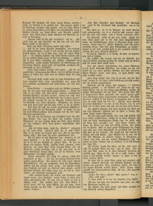 Gertraud sich durchaus mit einem jungen Manne verloben wollte, der sterblich in ste verliebt war. Wir dagegen wollten die Verlobung durchaus nicht zugeben, weil der junge Mann ein großer Taugenichts zu sein schien und wahrscheinlich wegen schlechter Streiche von seinen Eltern nach Amerika geschickt wurde. Das kostete Fanny einige Thränen und Gertraud ge- rieth in Aufregung.