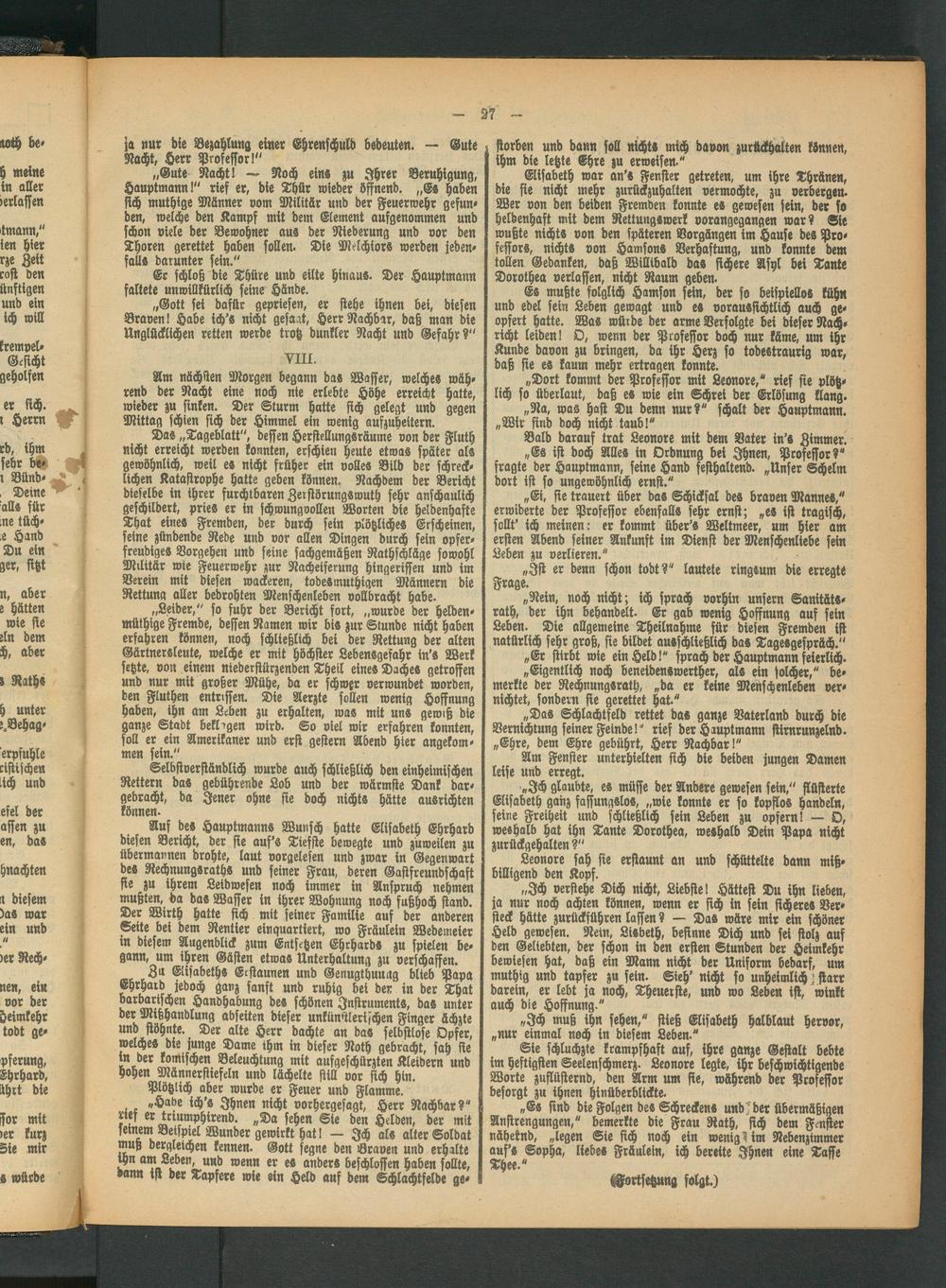 „Leider," so fuhr der Bericht fort, „wurde der Helden- müthige Fremde, dessen Namen wir bis zur Stunde nicht haben erfahren können, noch schließlich bei der Rettung der alten Gärtnersleute, welche er mit höchster Lebensgefahr in's Werk setzte, von einem niederstürzenden Theil eines Daches getroffen und nur mit großer Mühe, da er schwer verwundet worden, den Fluthen entrissen. Die Aerzte sollen wenig Hoffnung haben, ihn am Leben zu erhalten, was mit uns gewiß die ganze Stadt beklagen wird. So viel wir erfahren konnten, soll er ein Amerikaner und erst gestern Abend hier angekom- men sein."