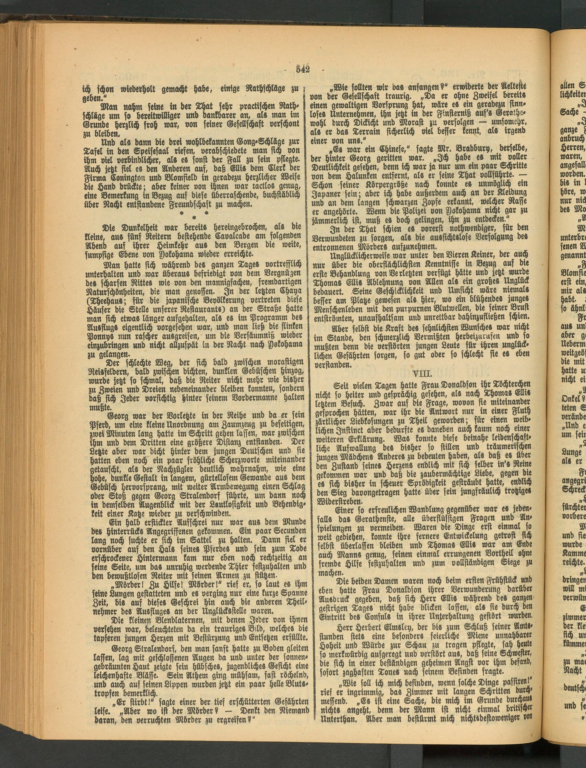 „Er war ein Chinese," sagte Mr. Bradbury, derselbe, der hinter Georg geritten war. „Ich habe es mit voller Deutlichkeit gesehen, denn ich war ja nur um ein paar Schritte von dem Halunken entfernt, als er seine That vollführte. — Schon seiner Körpergröße nach konnte es unmöglich ein Japaner sein; aber ich habe außerdem auch an der Kleidung und an dem langen schwarzen Zopfe erkannt, welcher Rasse er angehörte. Wenn die Polizei von Yokohama nicht gar zu jämmerlich ist, muß es doch gelingen, ihn zu entdecken."